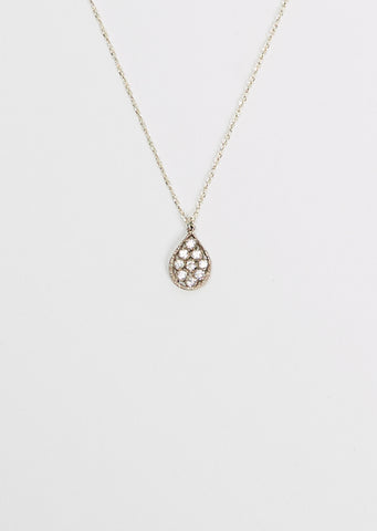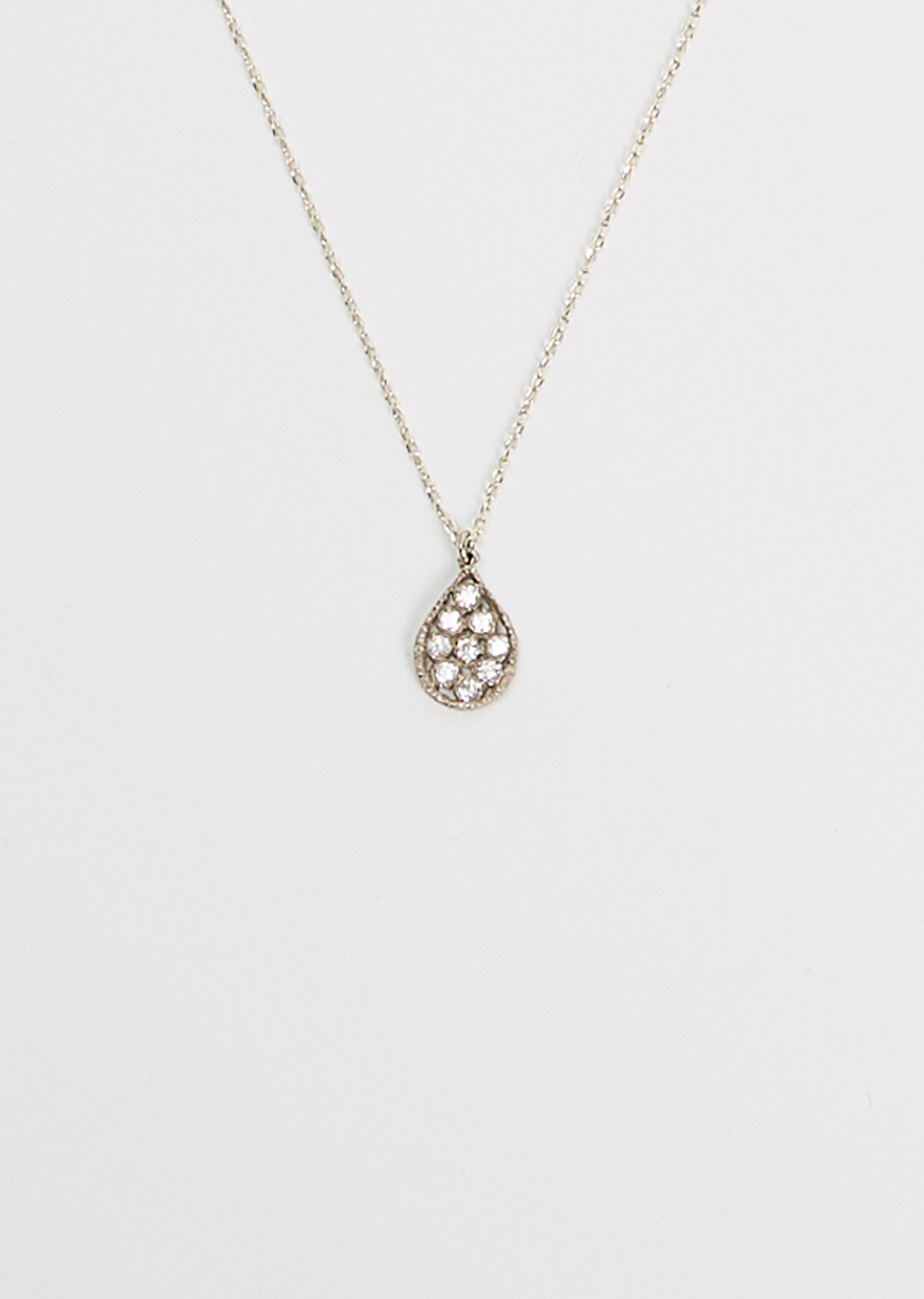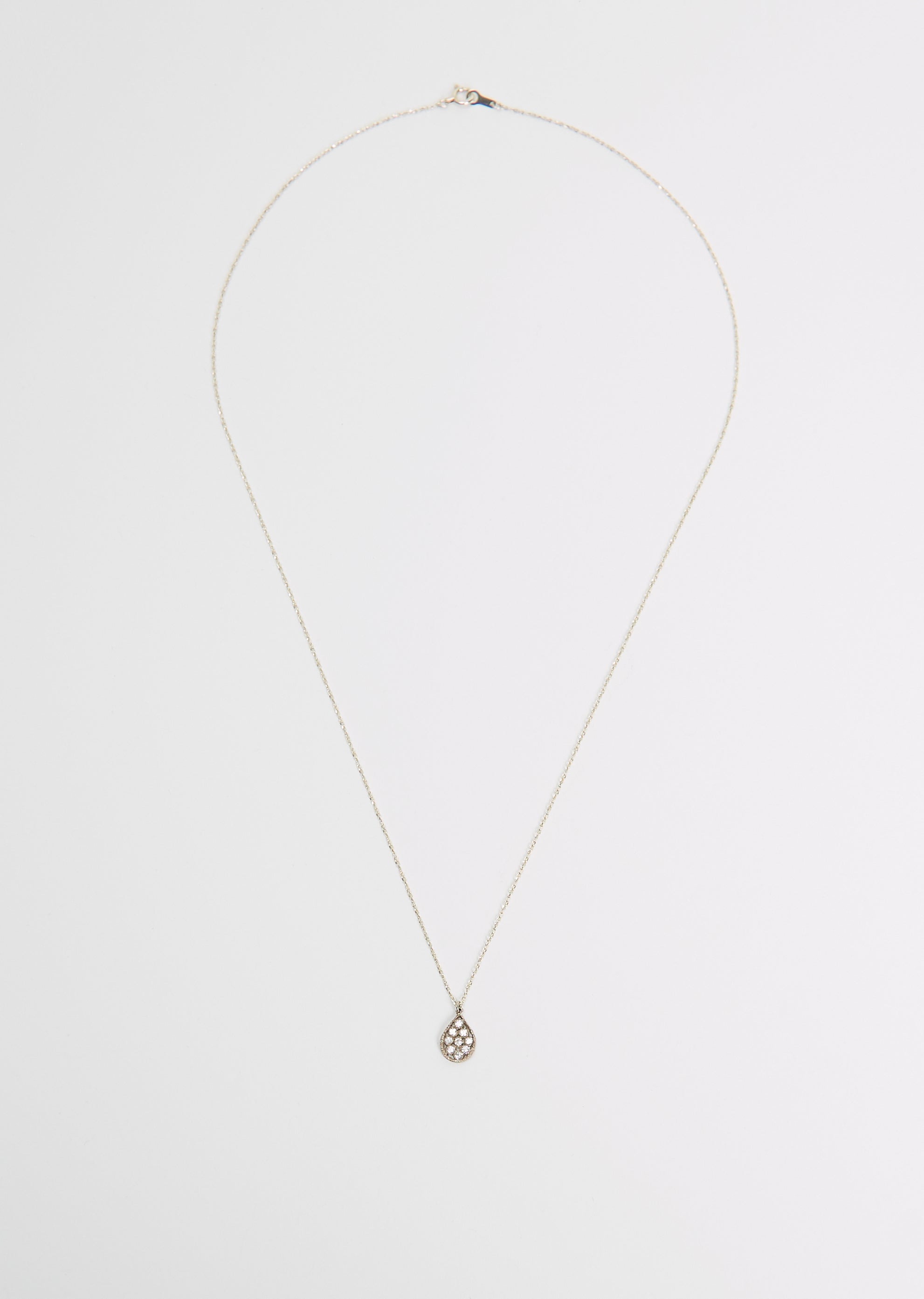 Noguchi Bijoux teardrop pendant with 9 white diamonds on a delicate chain with a ring clasp fastening in 14k white gold.