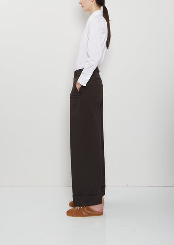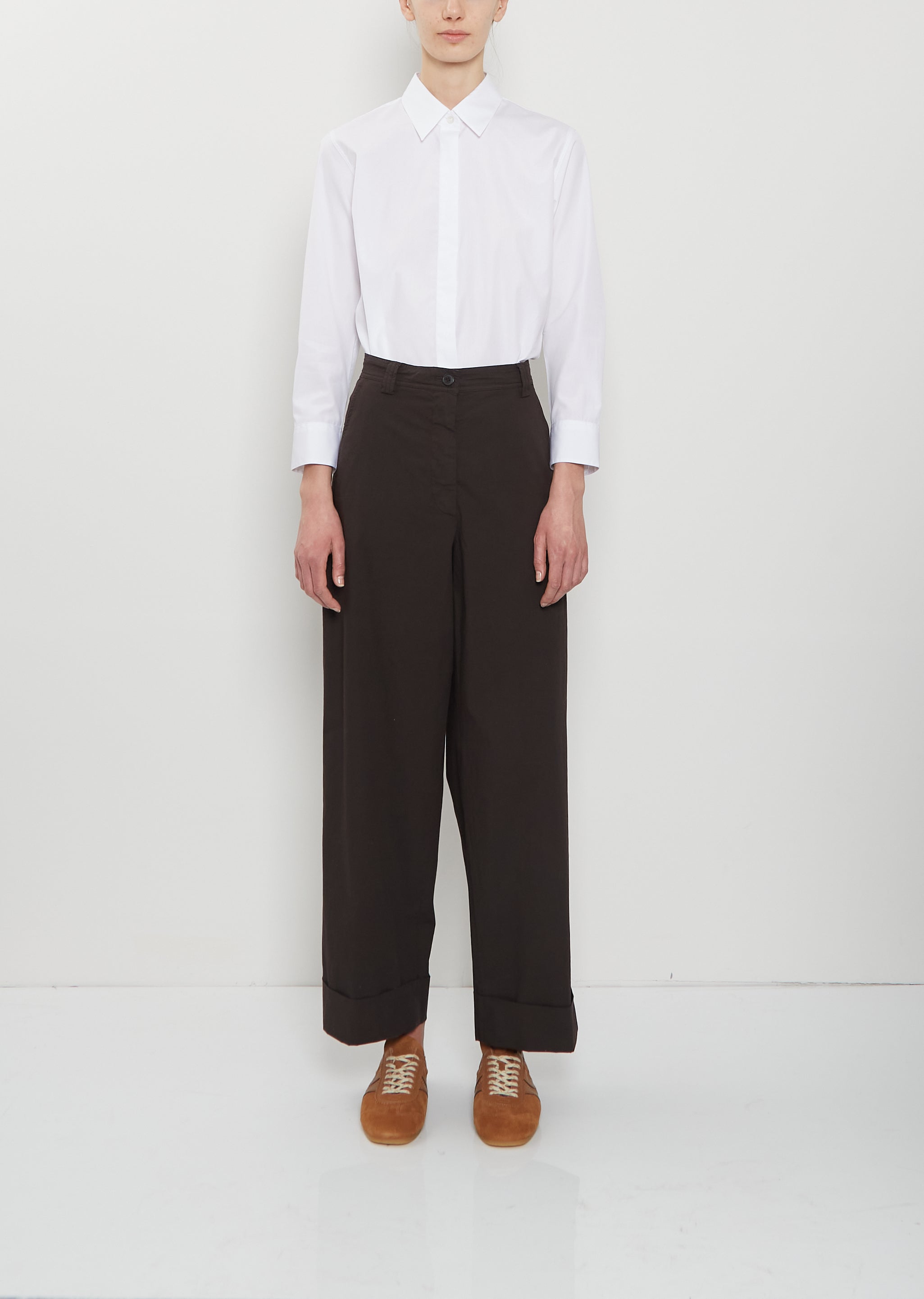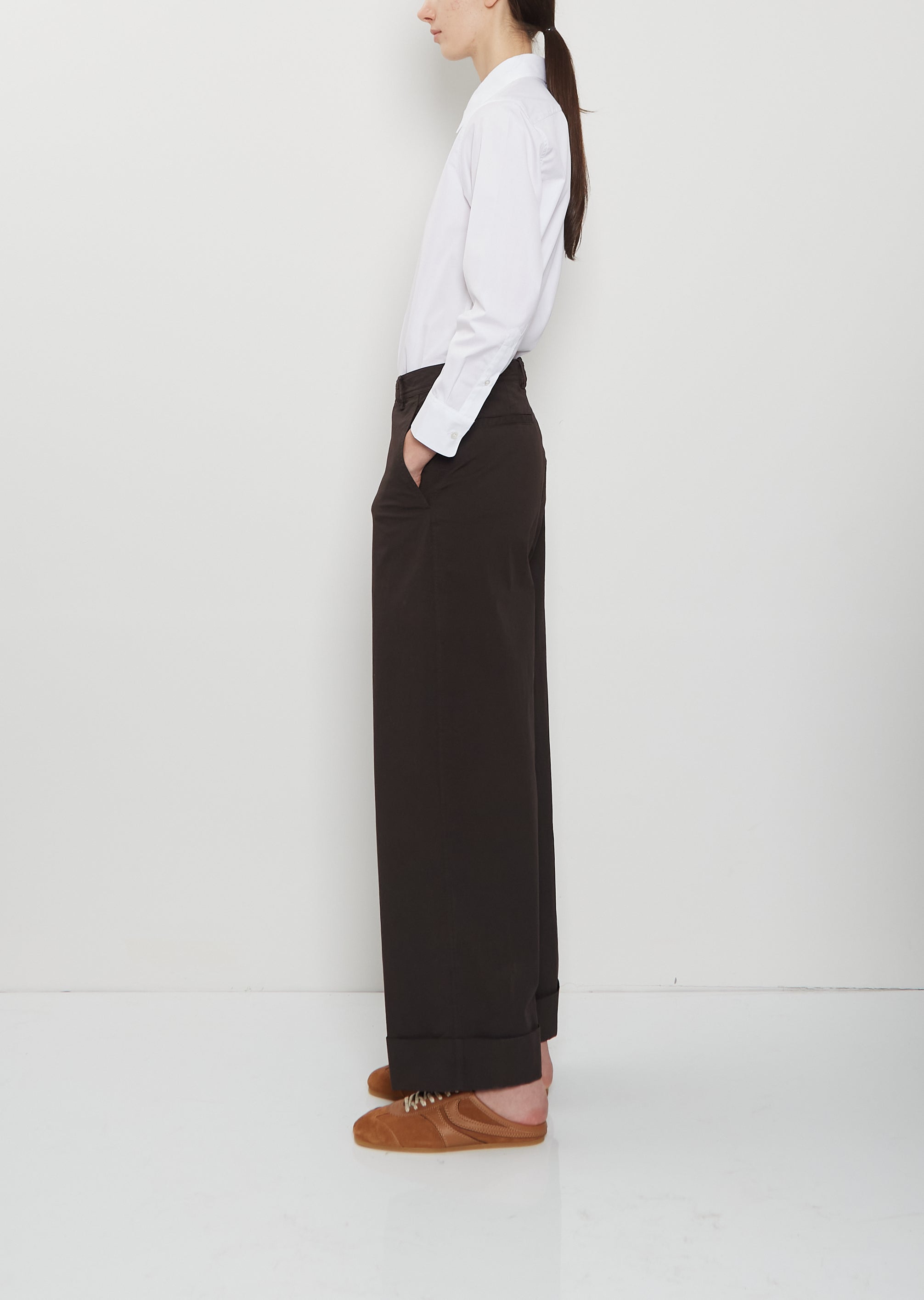 Dries Van Noten dark brown signature cuffed, straight-leg pants in lightweight and crisp cotton. Features angled side pockets, two rear welt pockets, belt loops, and a horn-hued button and zip fly fastening. Comes unlined. Relaxed, roomy fit.