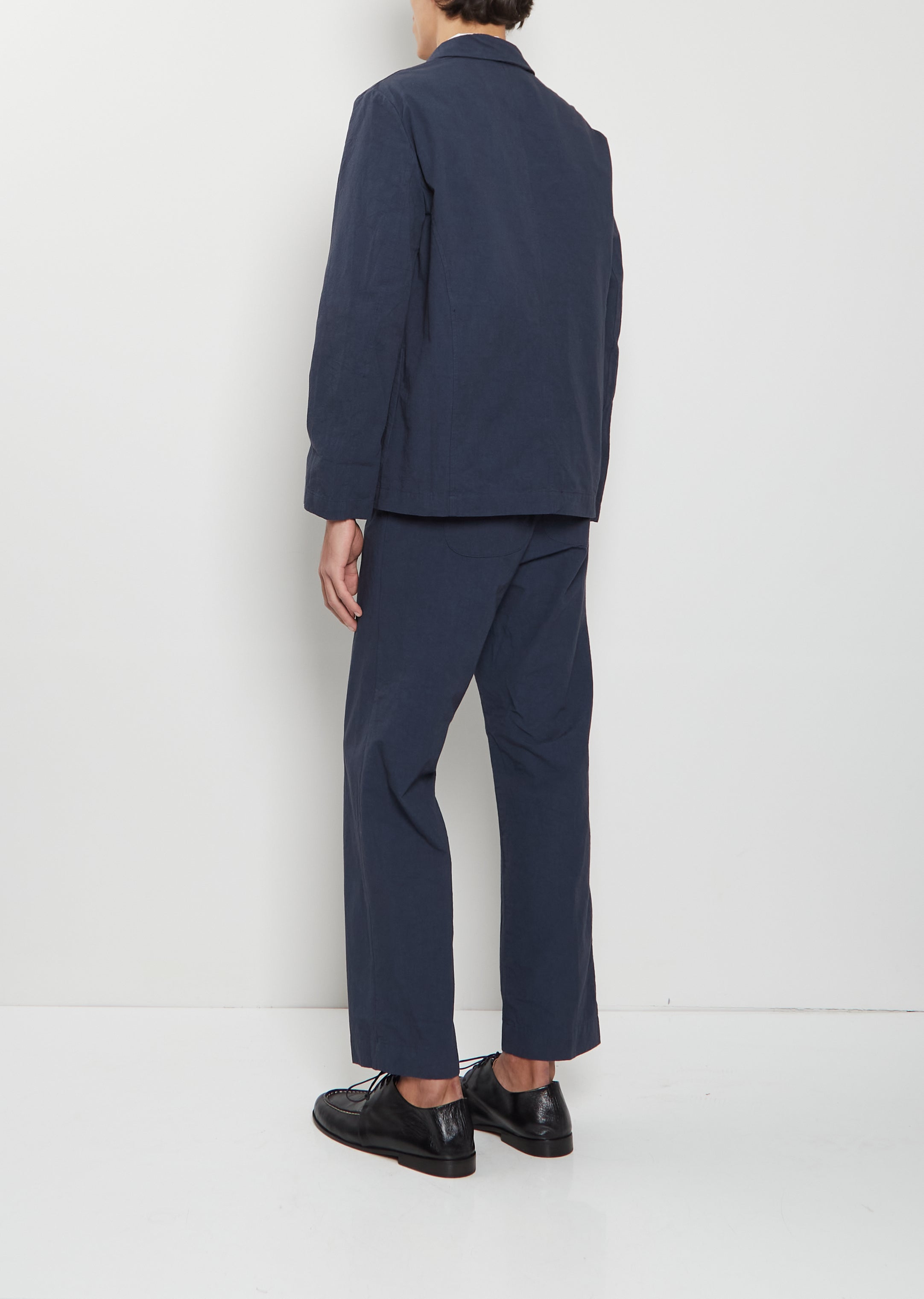 Bergfabel navy blazer with notched lapels and a two horn-hued buttons closure in crisp and lightweight cotton. Features slightly dropped shoulders, two patch pockets at waist, clean cuffs and straight hem. Comes unlined.
