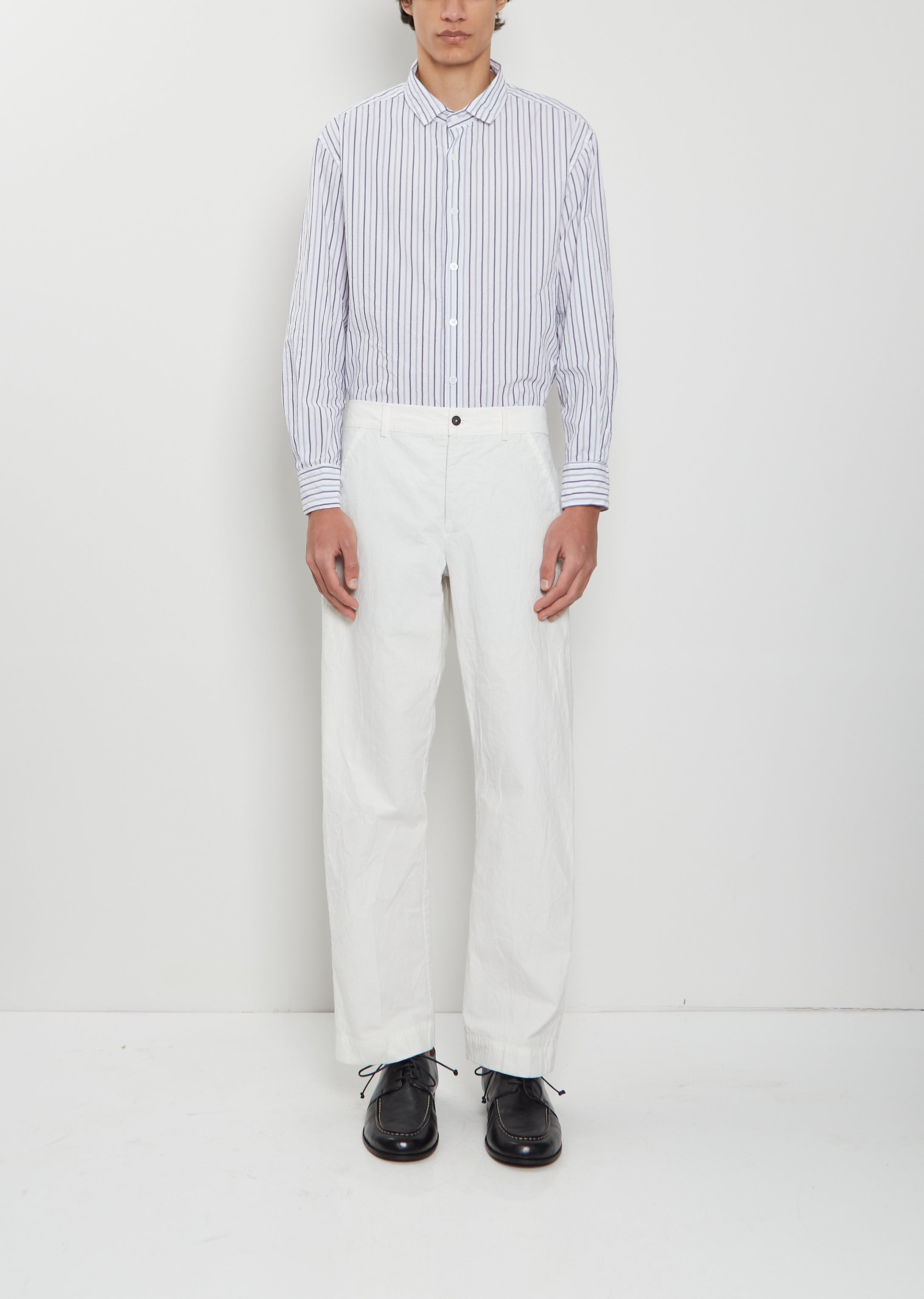 Bergfabel white trousers with slightly tapered legs and half elasticated waist in lightweight cotton. Features belt loops, concealed button fly, angled pockets, and back patch pockets.