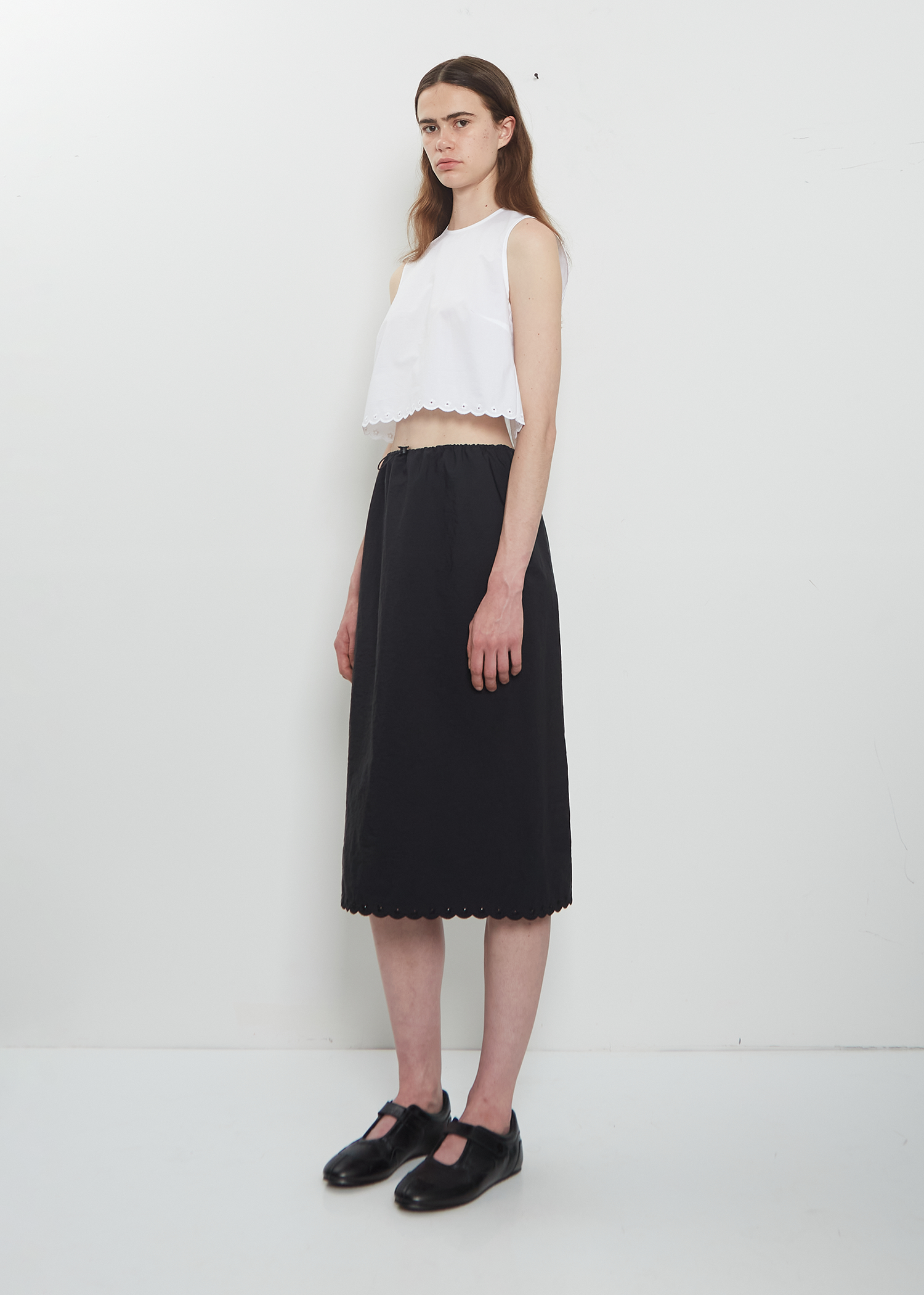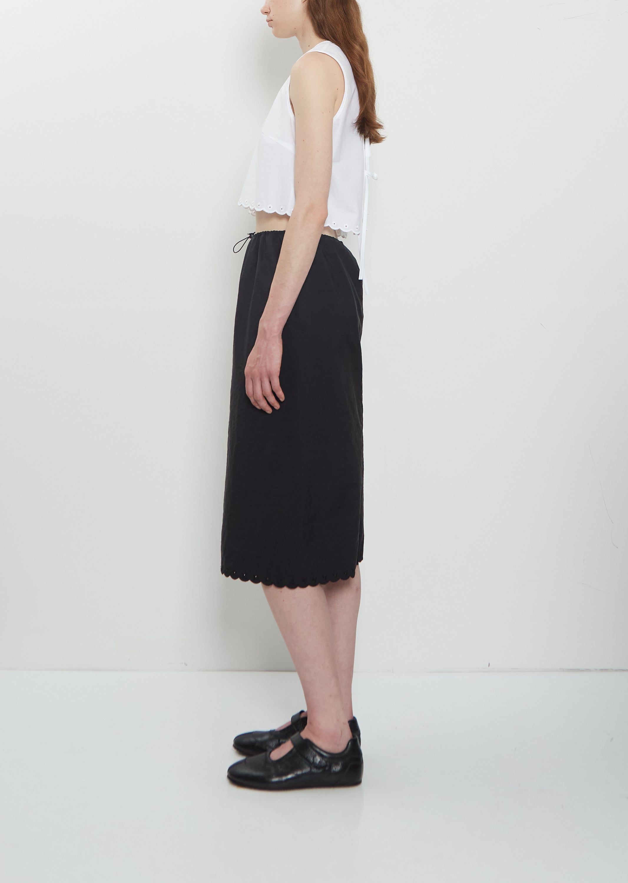 Cecilie Bahnsen black straight pull-on skirt with embroidered floral hem crafted in crisp taffeta. Features a slit at back and elasticated drawstring at waist with floral shaped cord lock. Regular fit. Comes unlined.