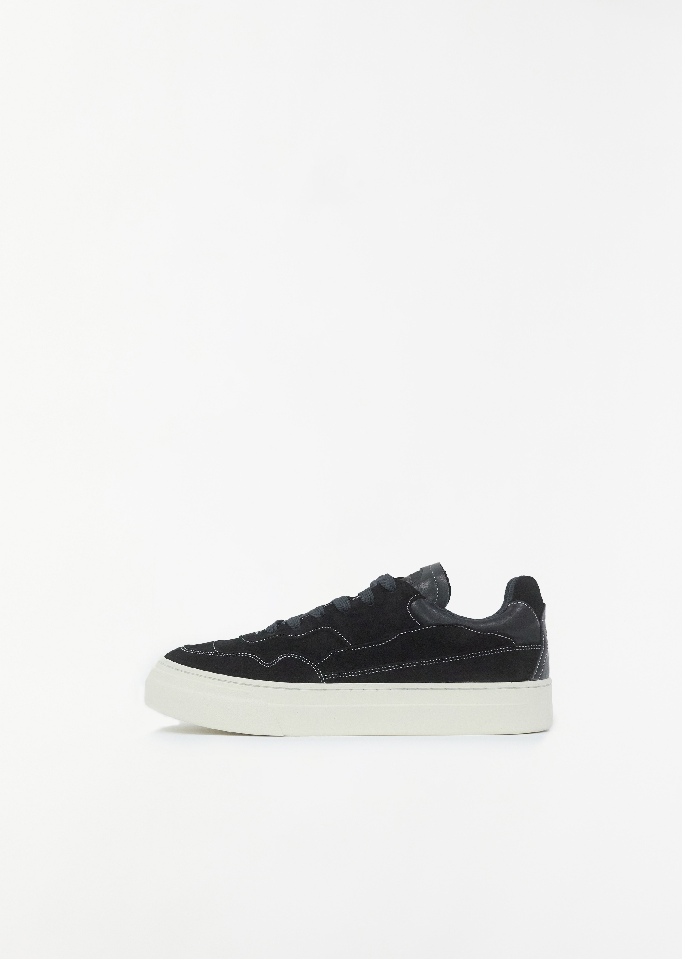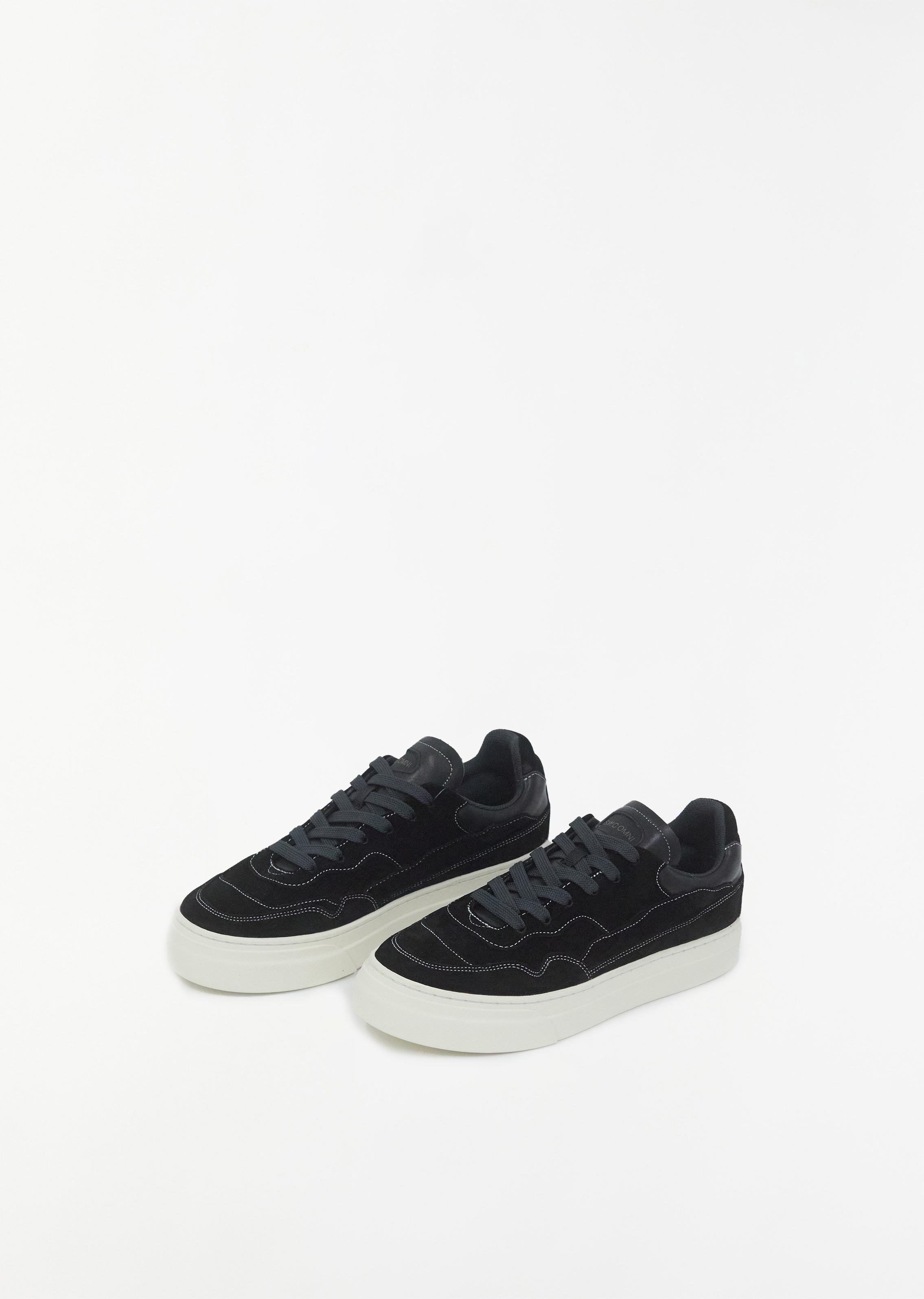 Stepney Workers Club black lace-up sneaker with asymmetric panel detailing and contrasting stitching in soft suede. Features an ultra-cushioned open-cell foam footbed with leather top layer, calf leather padded tongue with cut-out branding window, running-grade performance padding, linings and press-moulded hind-foot padding islands, and a soft rubber sole mixing natural rubber content with abrasion-resistant technical compounds.