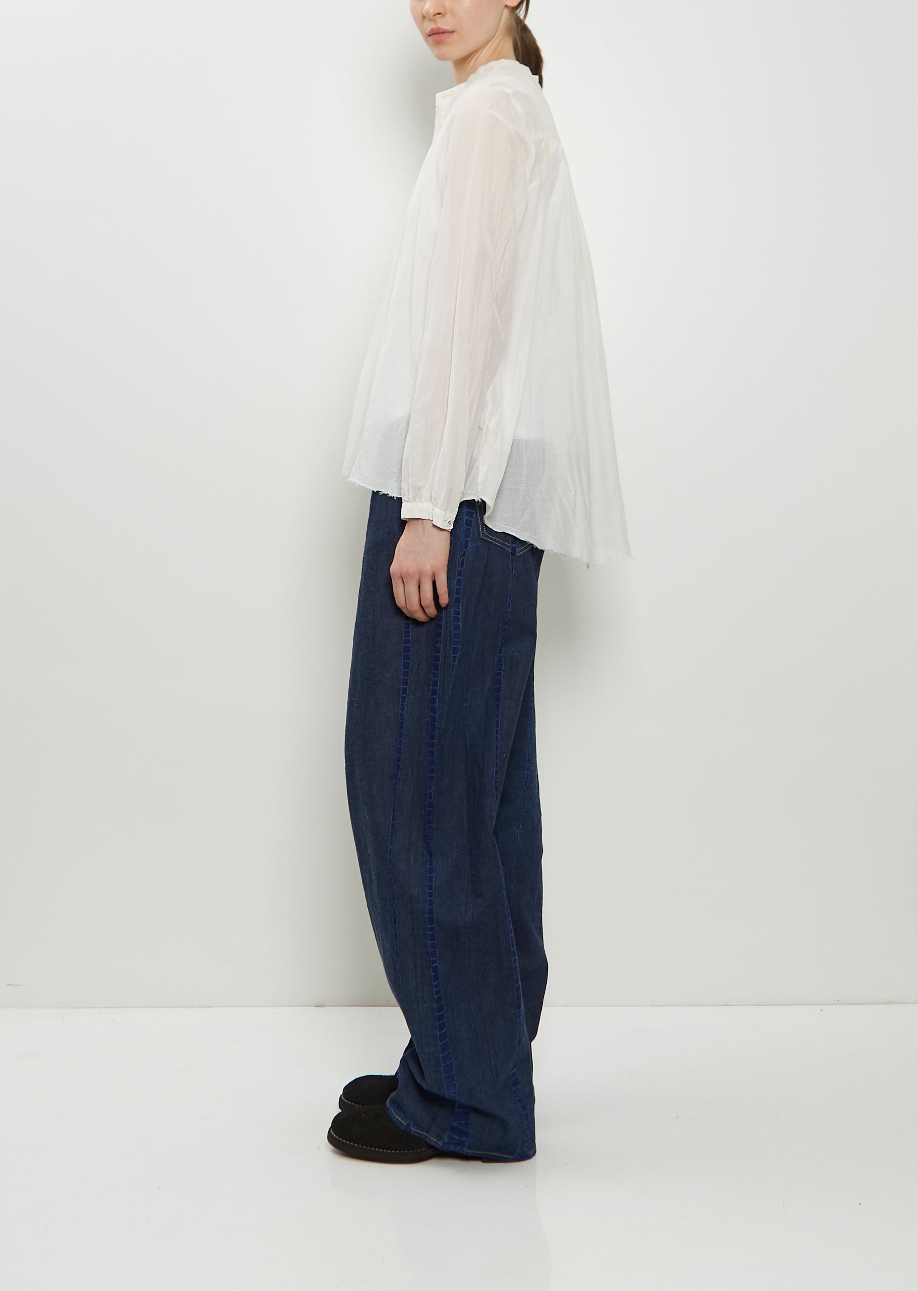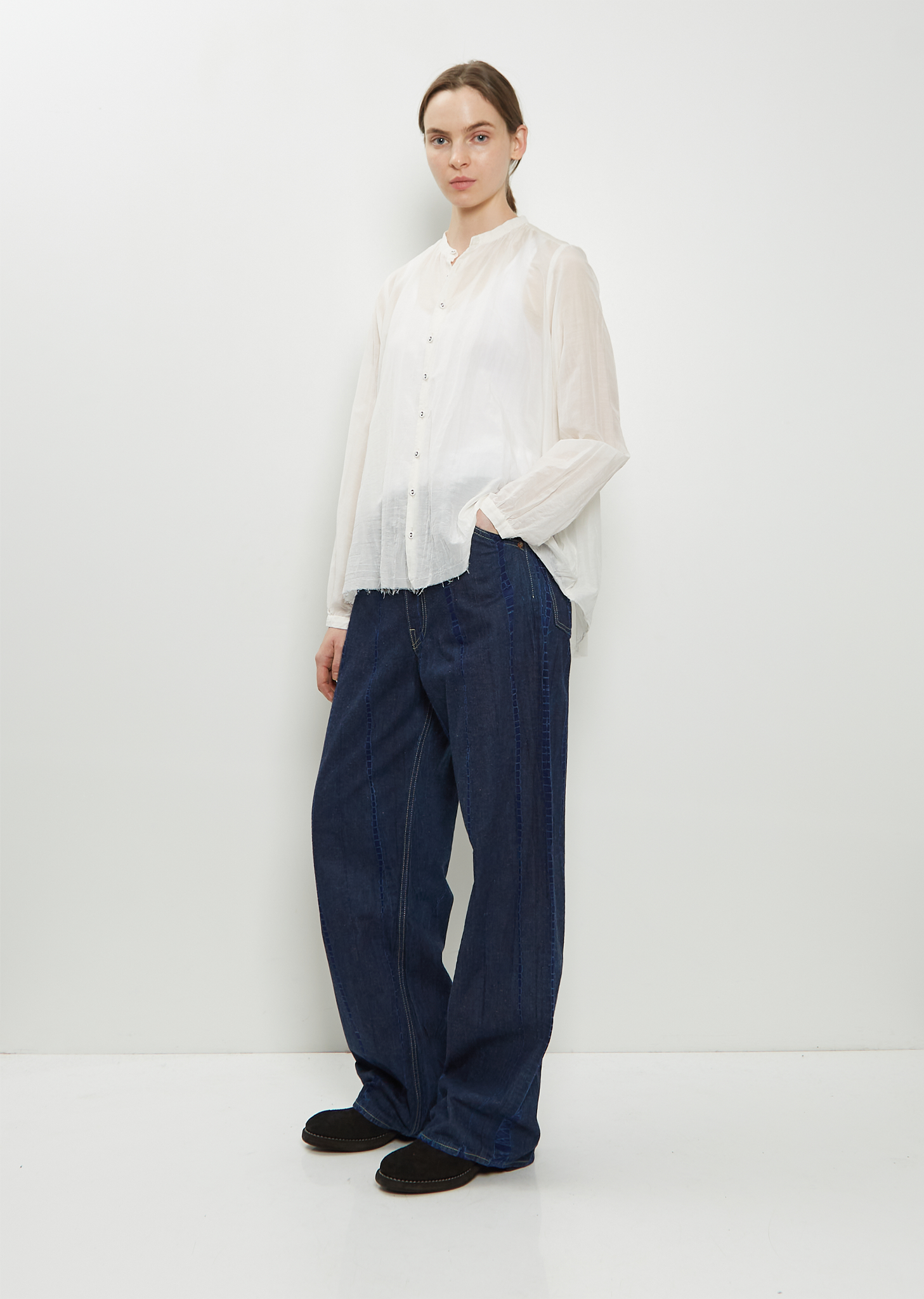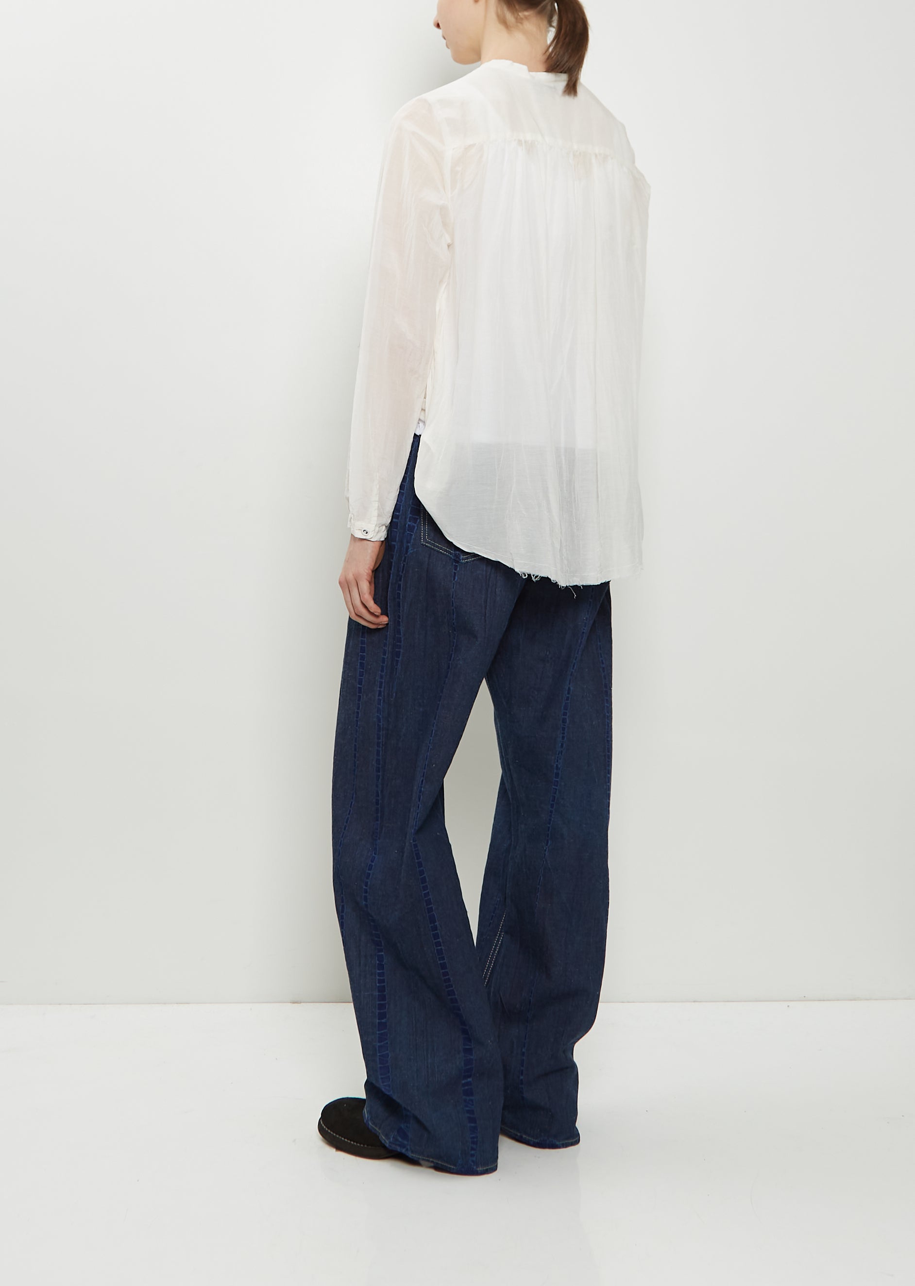 Pas de Calais off white blouse with a band collar and fabric-covered tonal buttons closure in a vegetable-dyed semi-sheer cotton and silk chiffon. Features a slightly gathered neckline, set-in shoulders and buttoned gathered cuffs. Finished with a raw edge at hem.