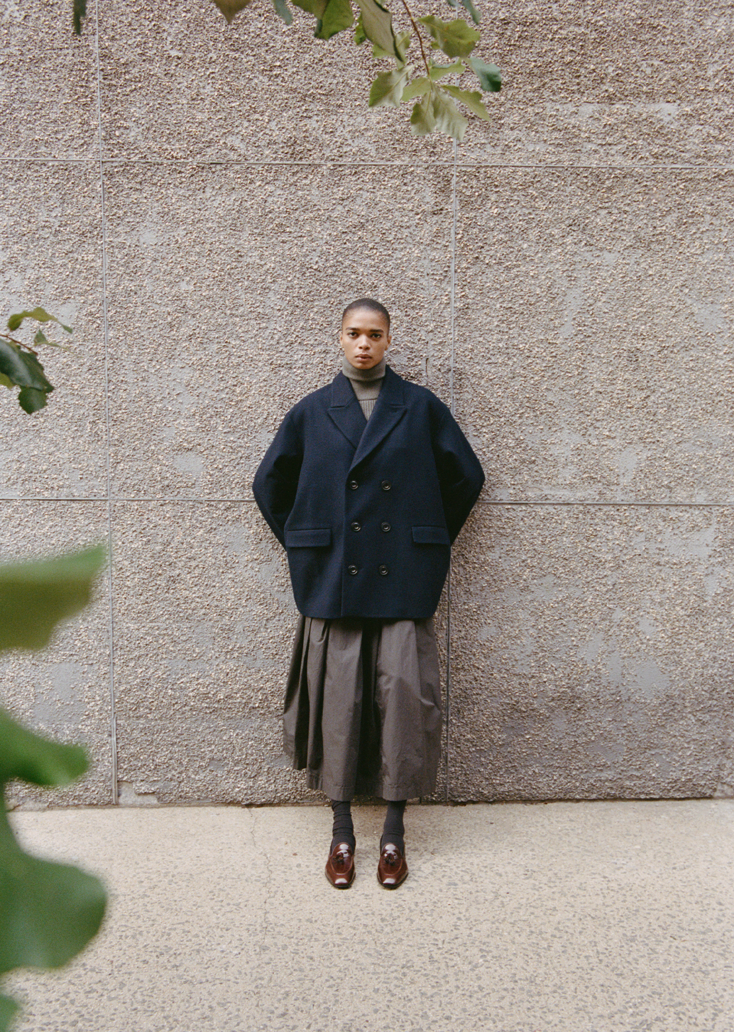 École de Curiosités dark navy double-breasted coat with sharp notched lapels and eight shell-hued buttons closure at front in mid-weight loden wool. Features dropped shoulders, wide sleeves and flap pockets. Lined in a tonal viscose and cotton blend twill.