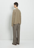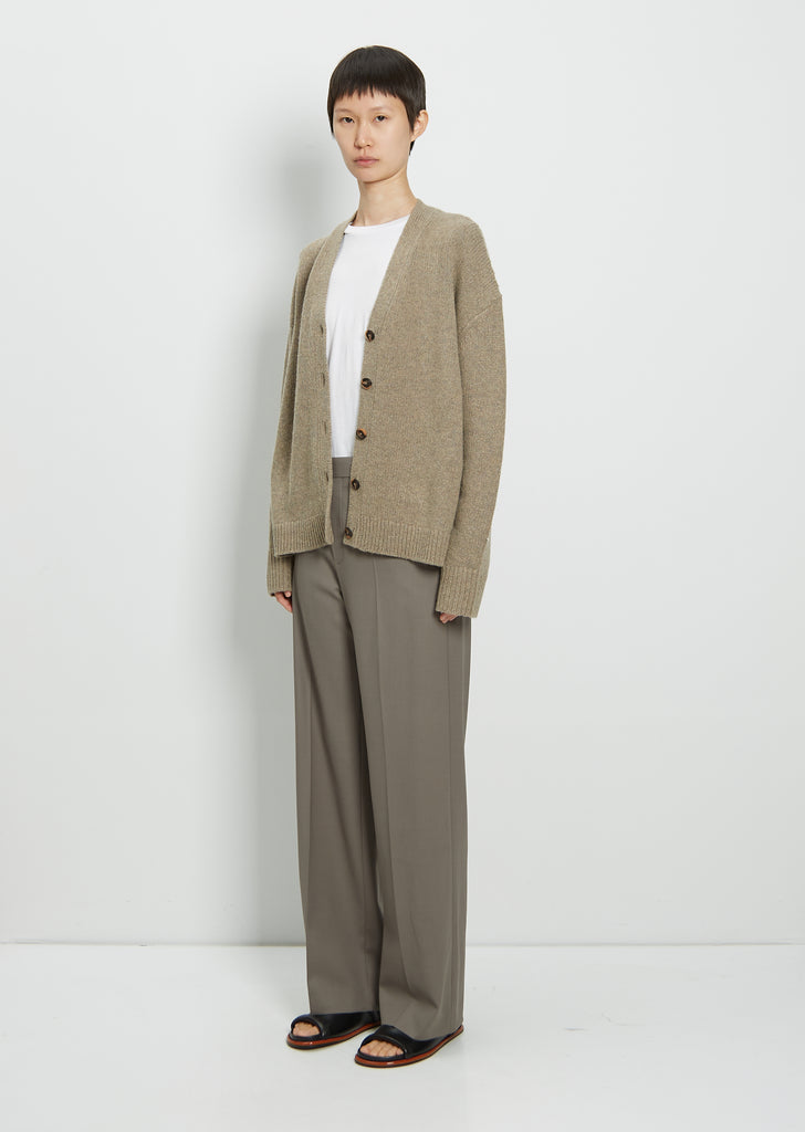 6397 V-neck cardigan with tortoise buttons in a merino wool blend. Rib trim sleeve cuffs and hem. Dropped shoulders. Relaxed fit with a slightly boxy shape.