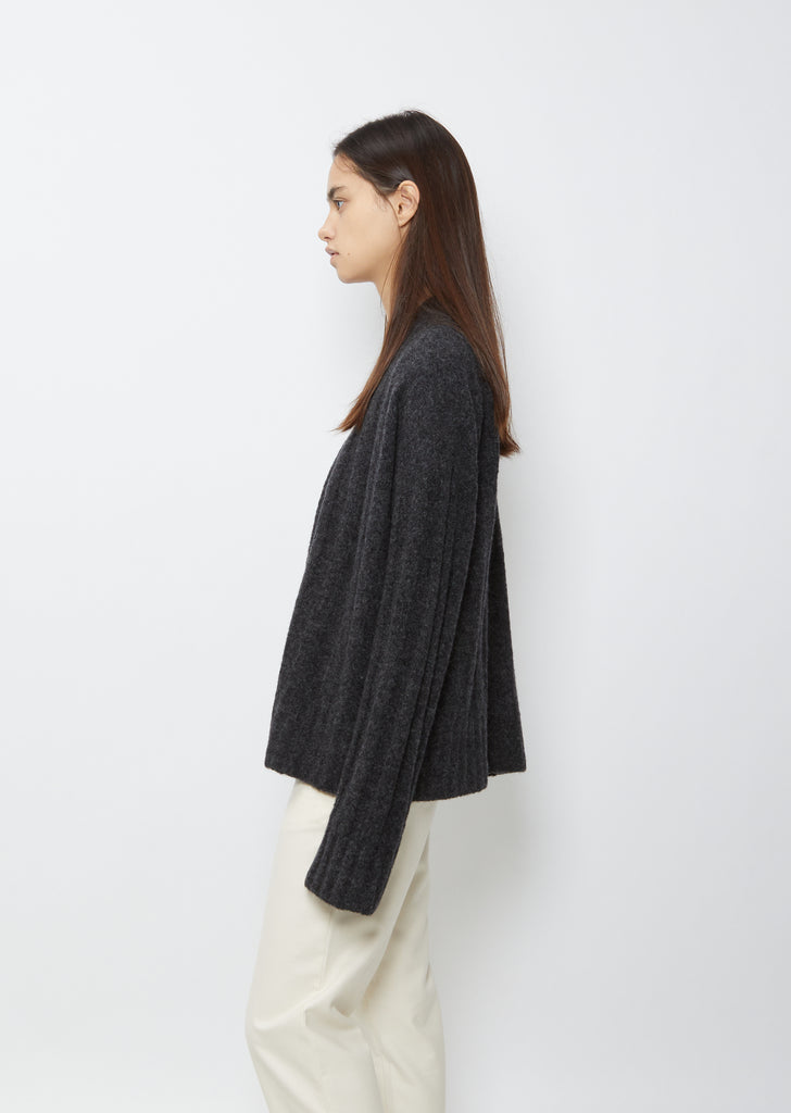 6397 charcoal grey v-neck cardigan with tonal button front closure in a merino wool and recycled cashmere blend.  Features large rib detailing throughout with rib trim finishings at neckline, sleeve cuffs and hem with a drop shoulder. Slightly oversized fit.