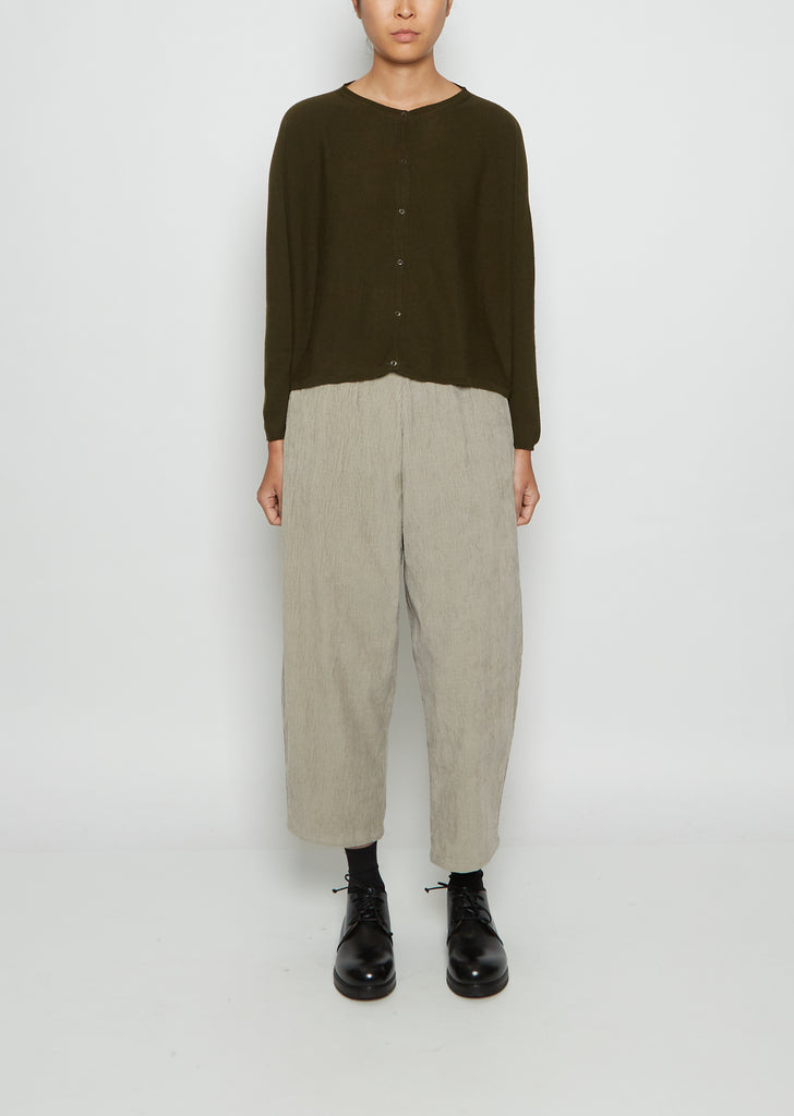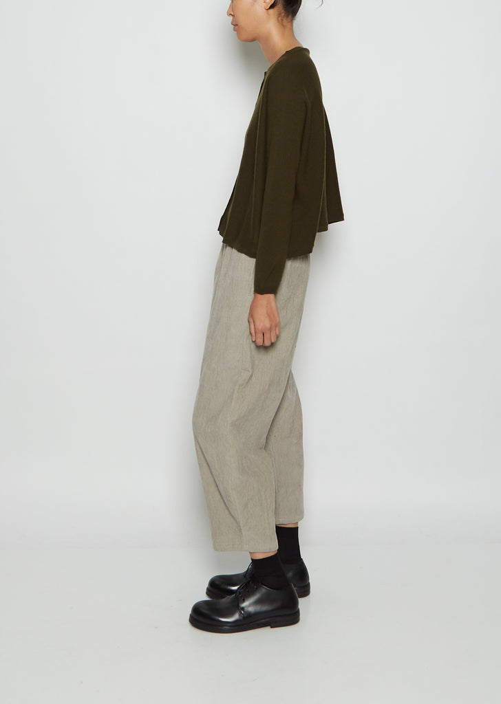 Apuntob military green crewneck cardigan sweater with a seamless sleeve and mini rib finishing at neckline and sleeves cuffs in pure cashmere.