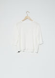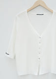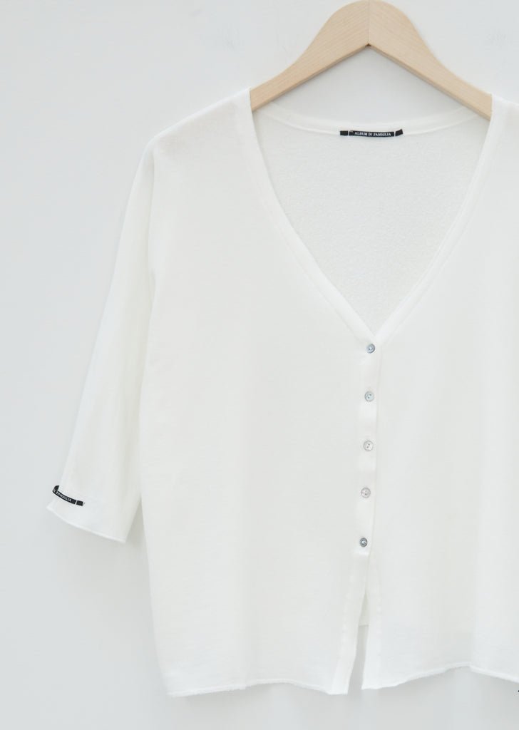 Album di Famiglia milk white signature cropped cardigan with dolman sleeves in a soft cotton stretch terry. Finished with contrast shell buttons. This perfect summer cardigan can be worn as a v-neck top. Relaxed fit.