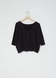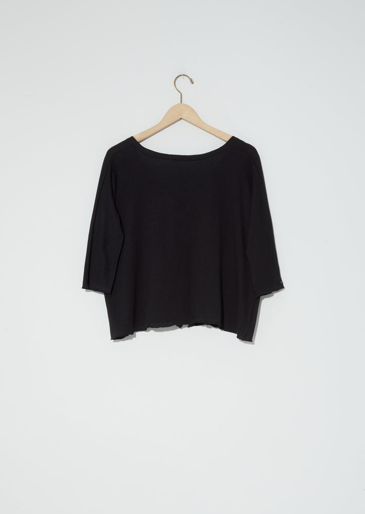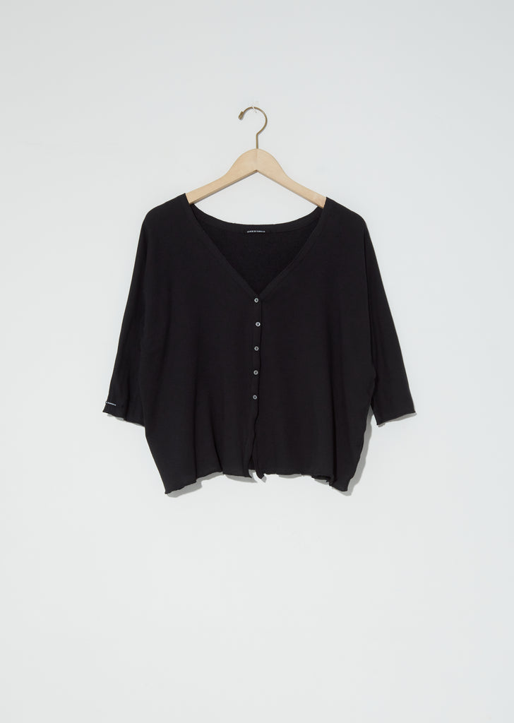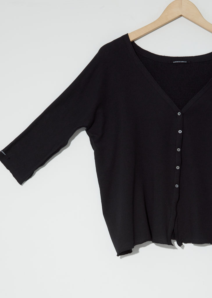 Album di Famiglia black signature cropped cardigan with dolman sleeves in a soft cotton stretch terry. Finished with contrast shell buttons. This perfect summer cardigan can be worn as a v-neck top. Relaxed fit.