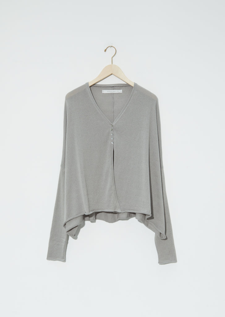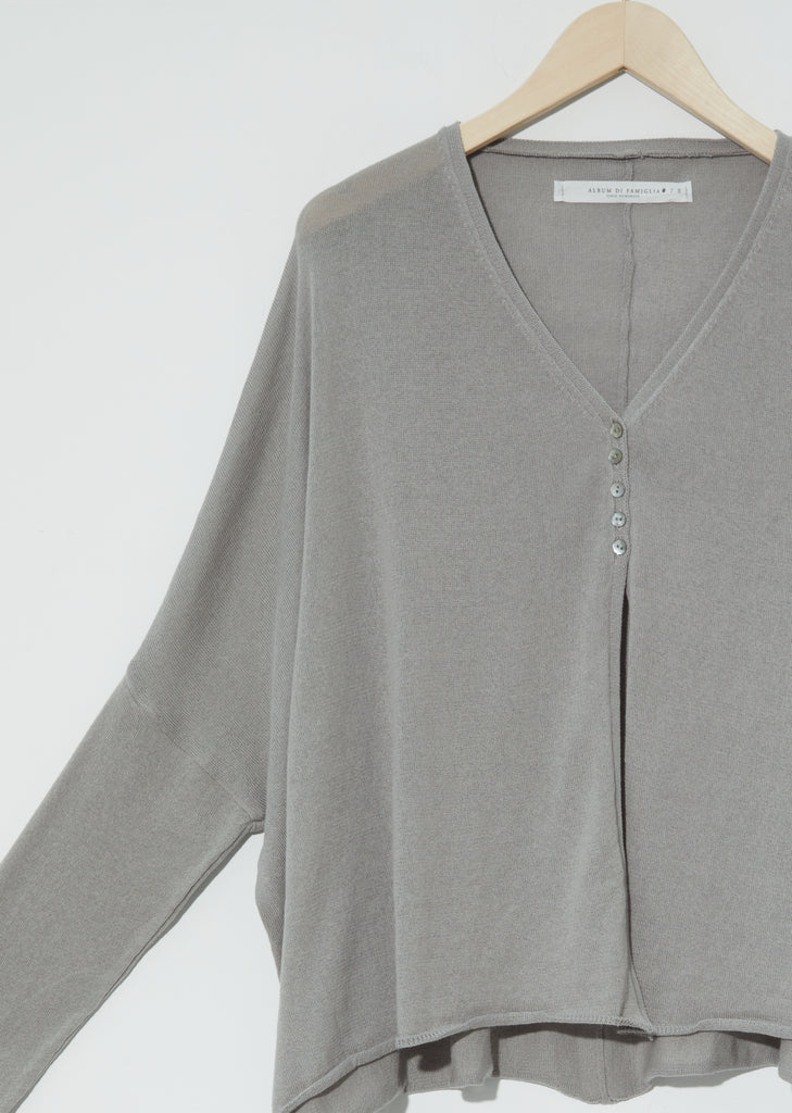 Album di Famiglia grey oversized v-neck cardigan in cotton knit. Half-open front with buttons at top. Finished with shell buttons. Oversized fit.