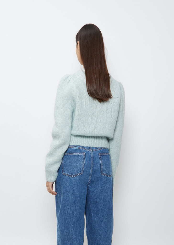 Amomento pale mint green cropped v-neck cardigan sweater in a textured mohair blend. Features a covered placket snap front closure tonal contrast yarn trim. Rib finishes at sleeve cuffs and hem. Puff sleeve detail at shoulder. Relaxed fit.