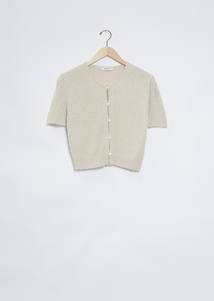 Amomento ecru shrunken short sleeve crewneck cardigan sweater in a textured nylon & acrylic blended knit.