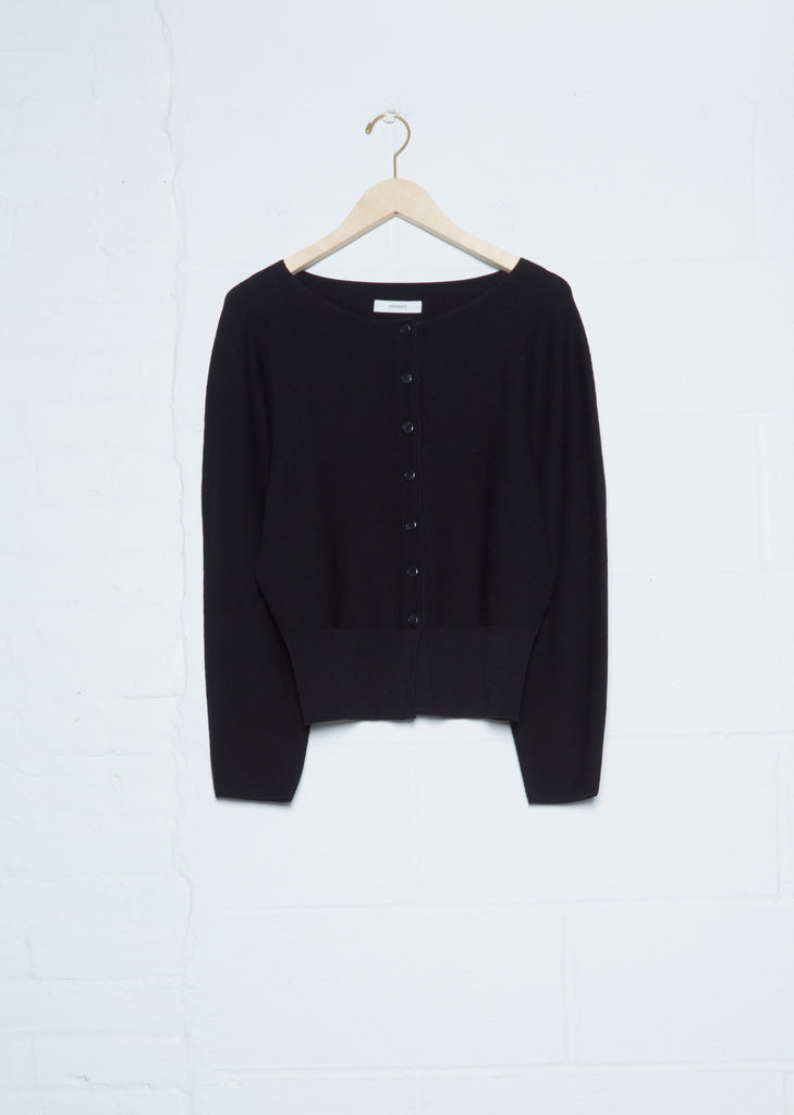 Amomento black boatneck round cardigan stretch fine jersey.
