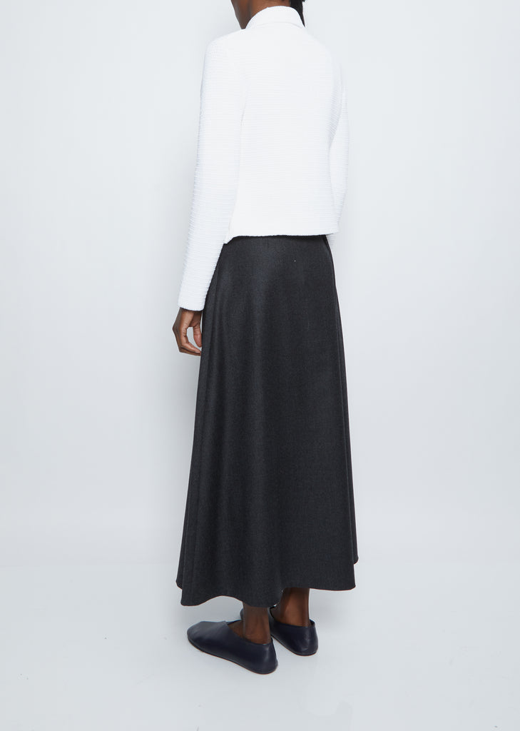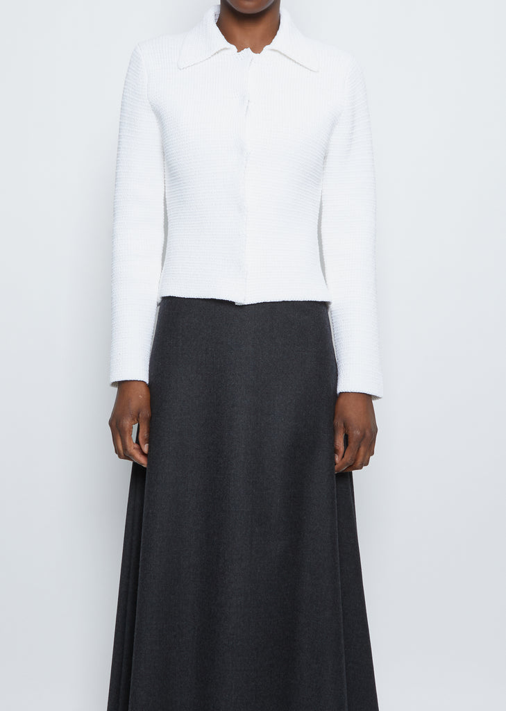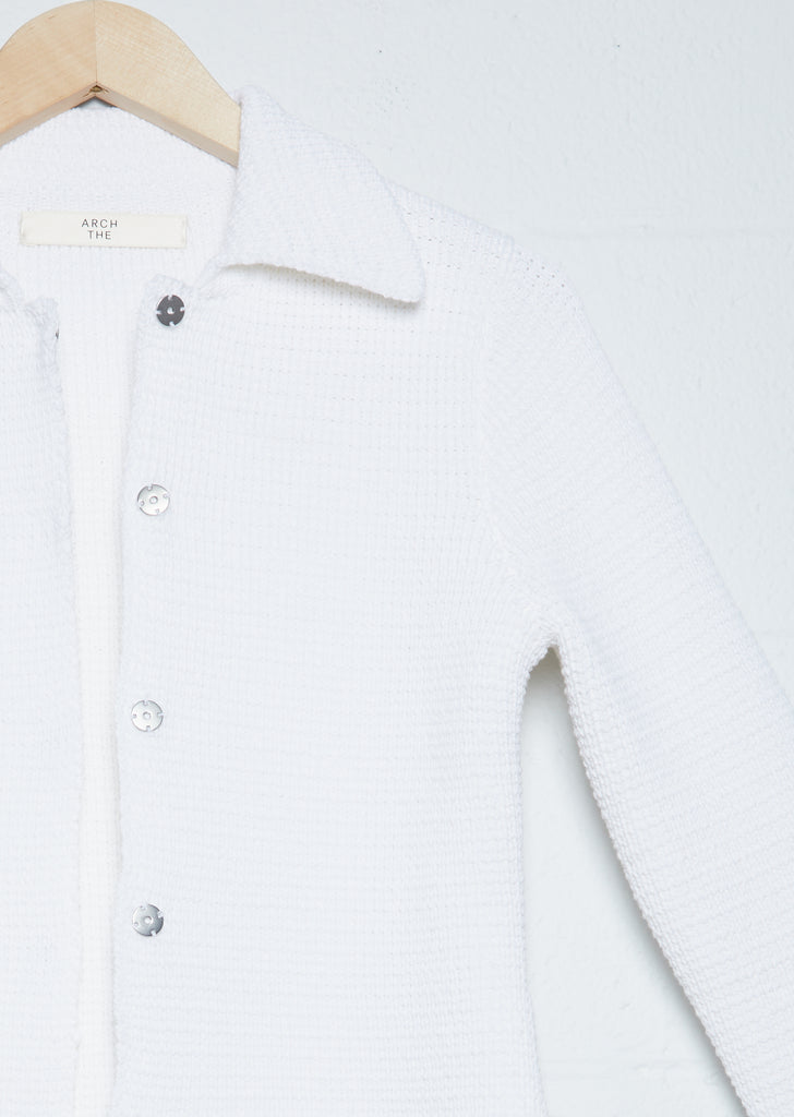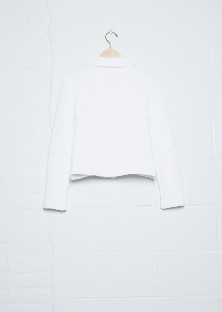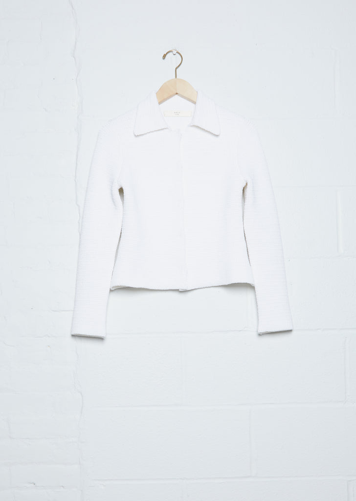 Arch The collared cardigan sweater jacket in a heavy-weight white cotton stretch knit. Features a concealed snap front closure with clean hemline and sleeve cuffs. Fits closer to the body.
