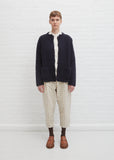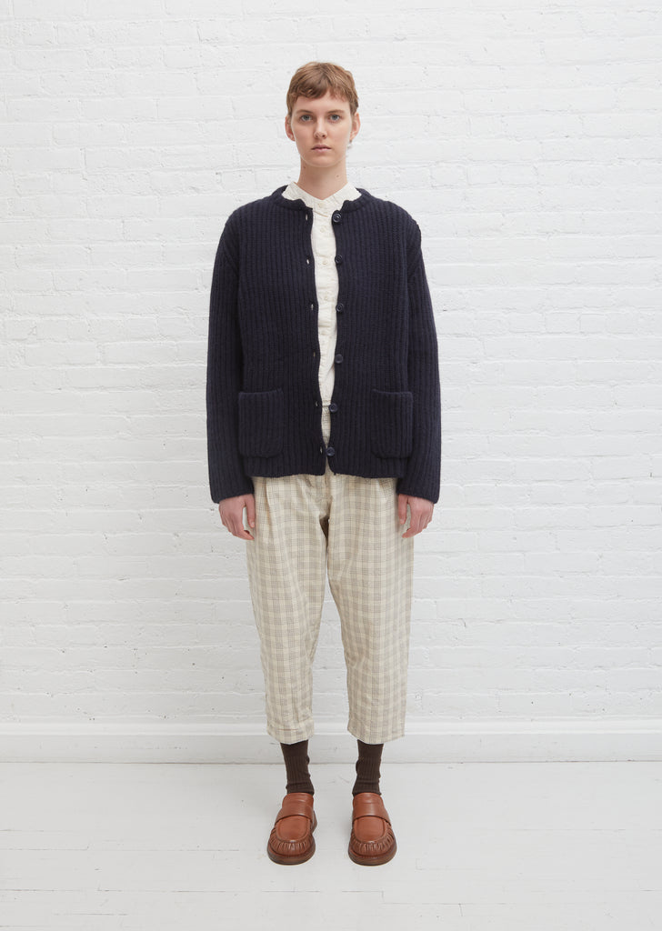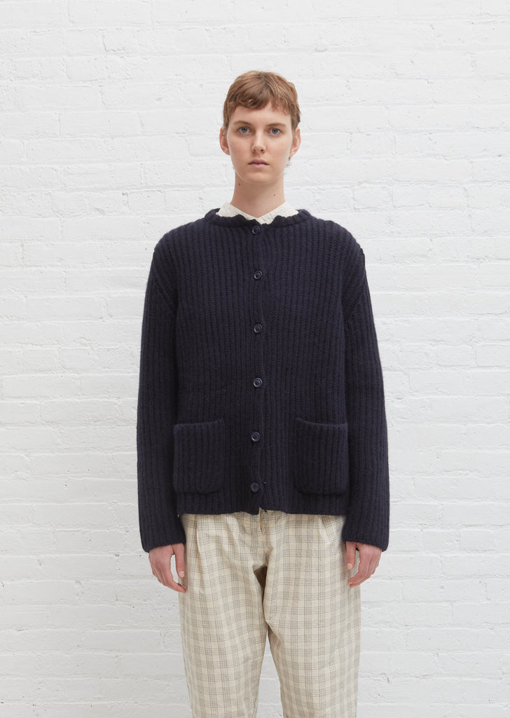 Casey Casey dark steel navy round collar cardigan with patch front pockets in chunky superfine wool and angora blend rib. Finished with tonal brown buttons and self rib collar. Straight silhouette with a slightly fuller back. Relaxed fit.