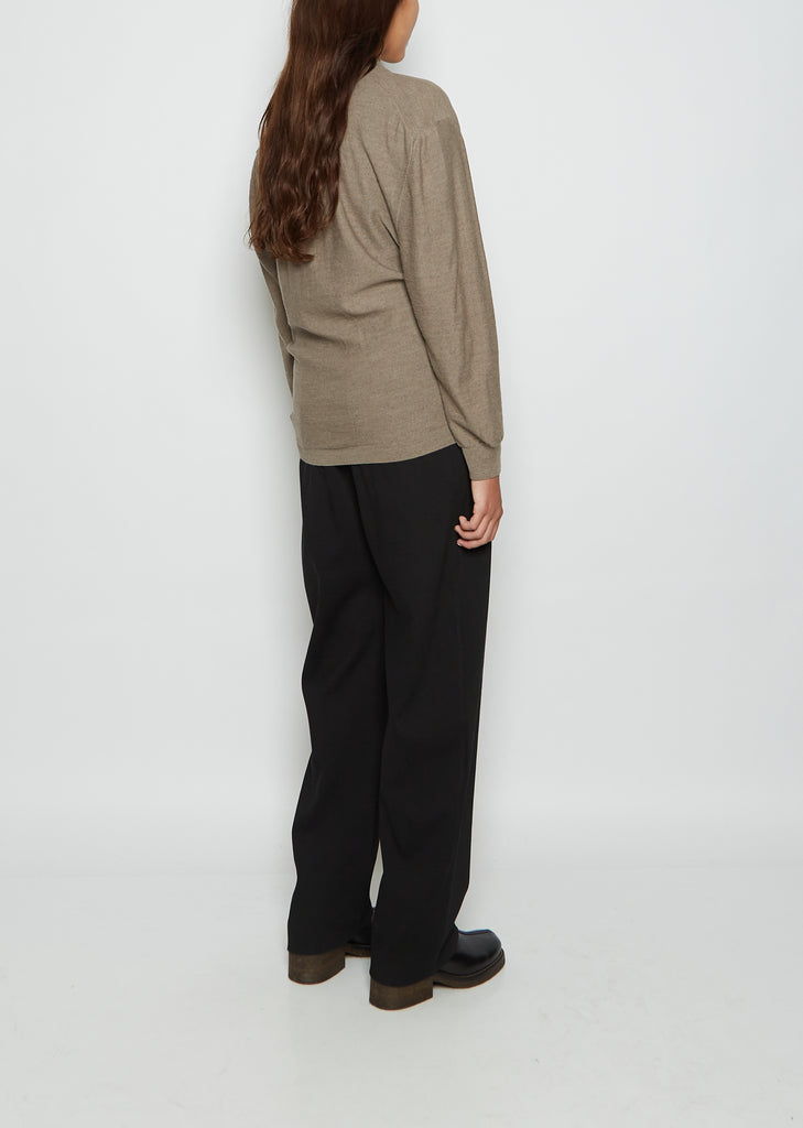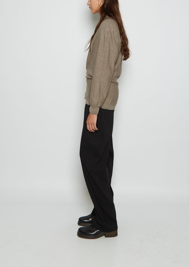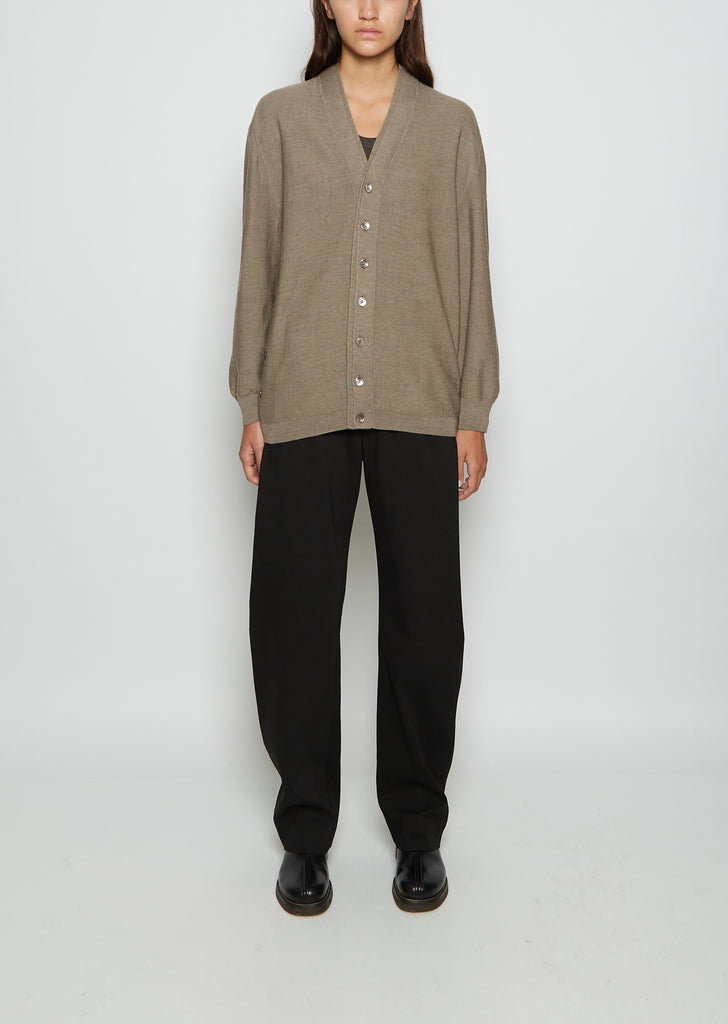 Lemaire classic v-neck cardigan sweater with double layered front rib trim in a grey beige merino wool and acrylic blended knit. Features an asymmetrical button placket that closes over the hip, wrapping around the body at the waist.