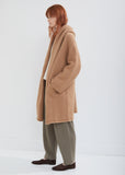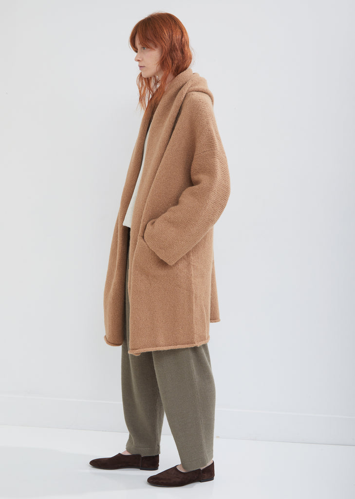 The label's Capote coat in dune, hand-loomed in a warm alpaca blend. This open-face coat features a relaxed fit with elegant shawl lapels and wide sleeves. Finished with subtle seam detailing throughout. Color: Dune. 93% Alpaca, 7% Polyamide. Made in Peru.