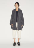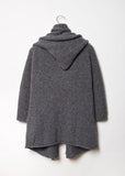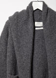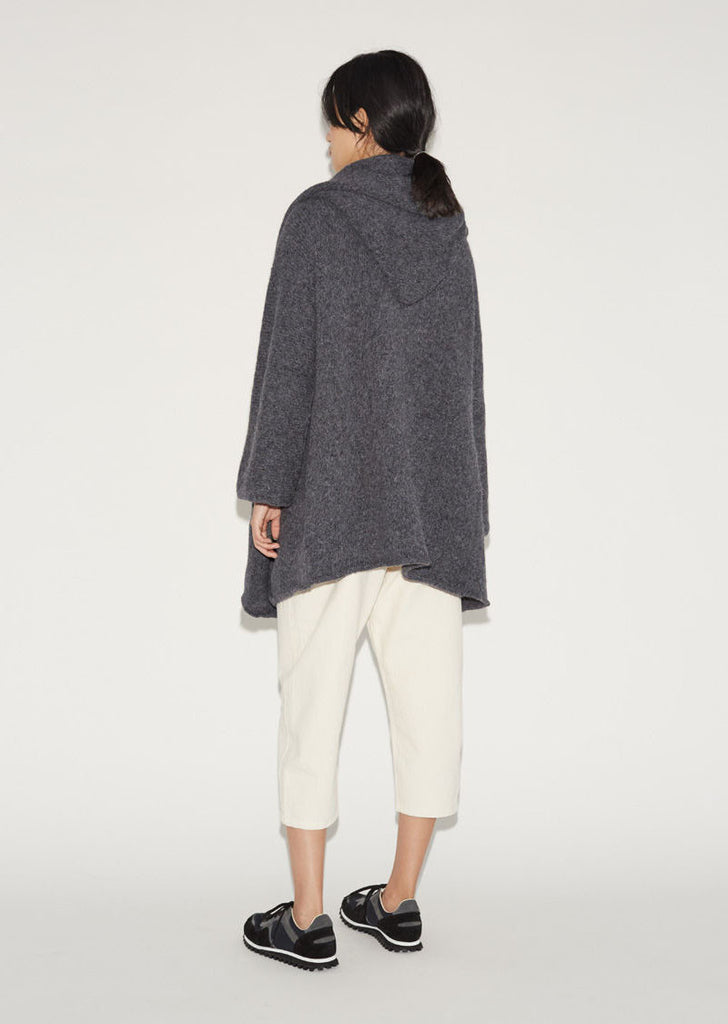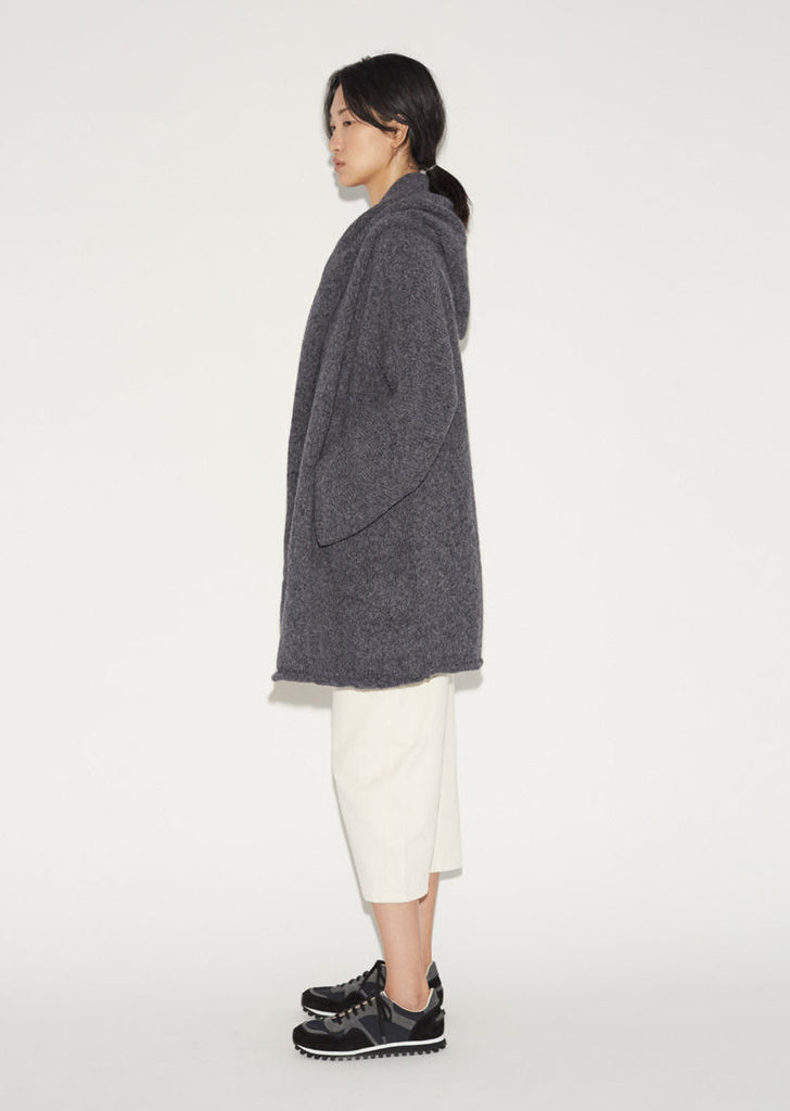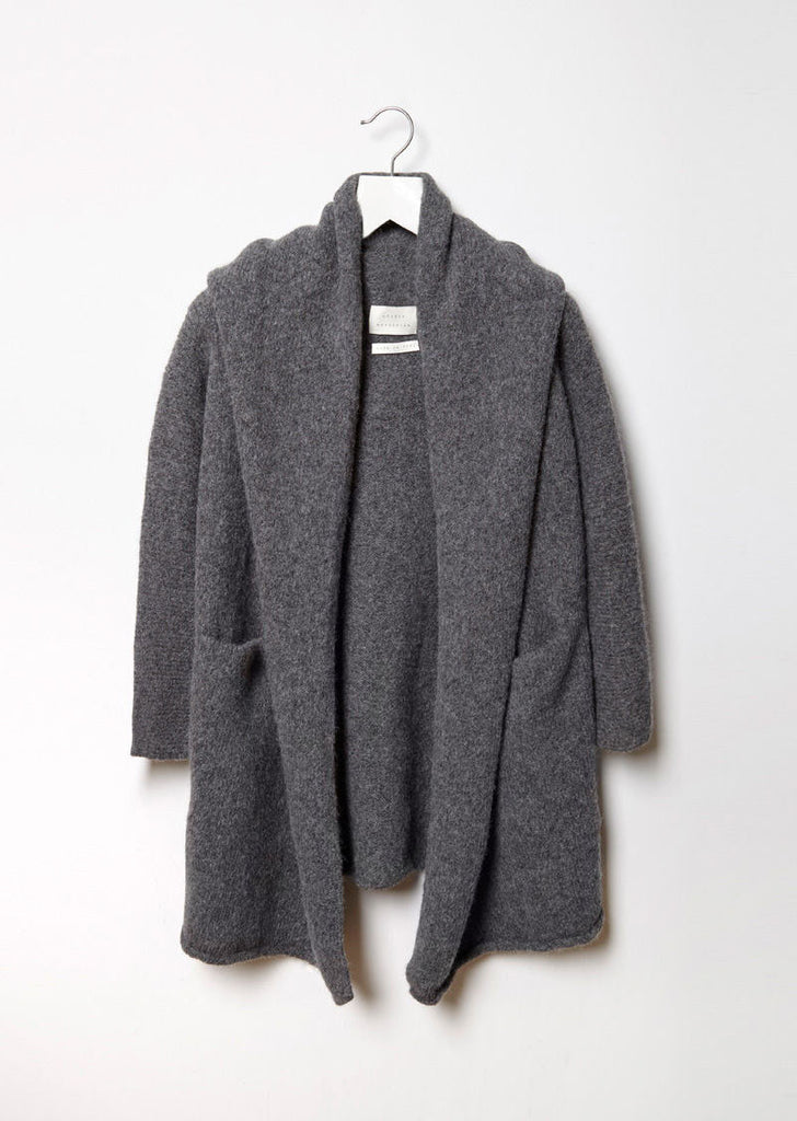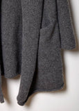 A soft, oversized sweater coat knit from soft charcoal alpaca yarn with large integrated pockets and an open front.