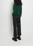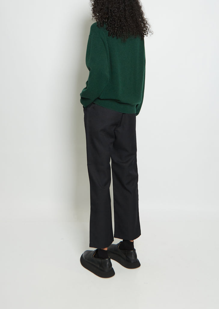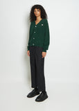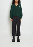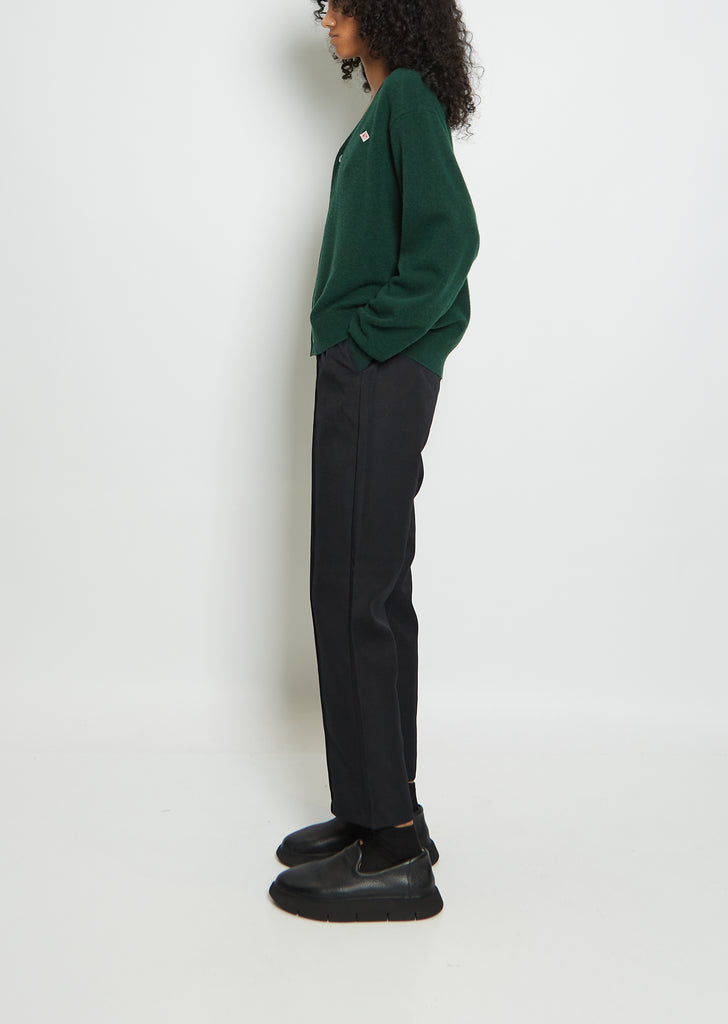 Danton green V-neck cardigan with contrast ivory buttons and rib trim finish at neckline, sleeve cuffs and hem. Danton logo patch at chest.