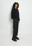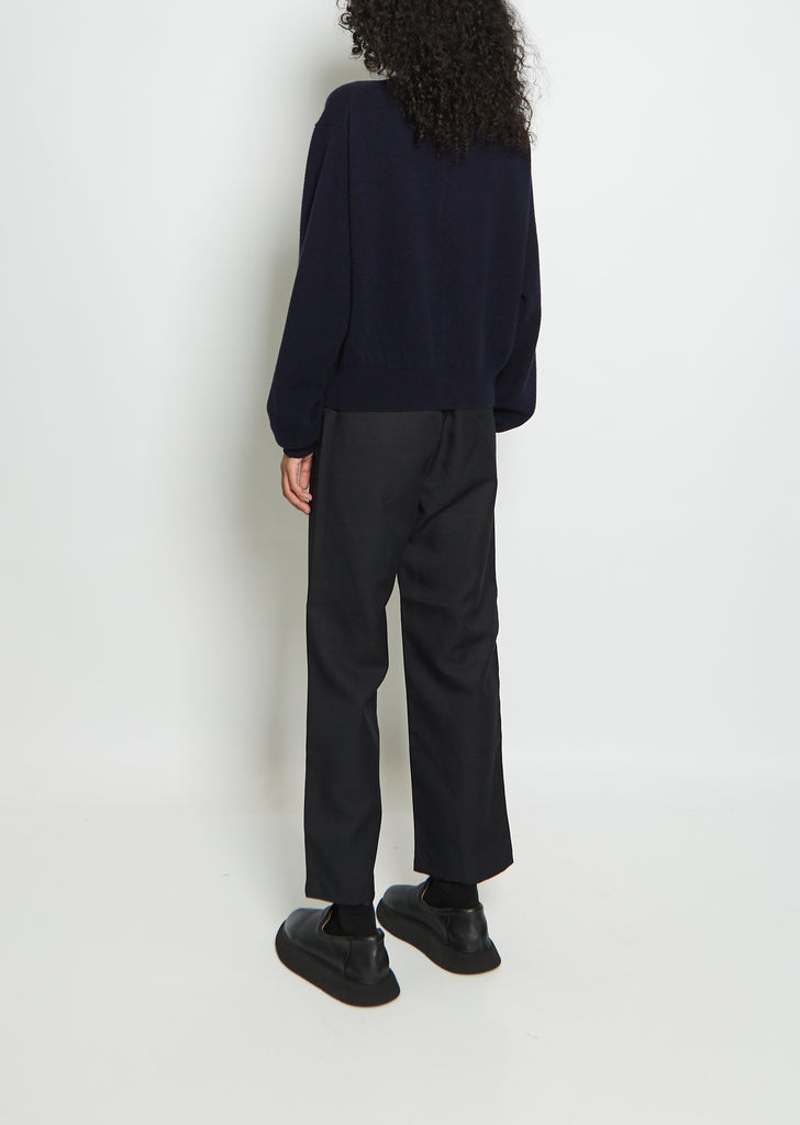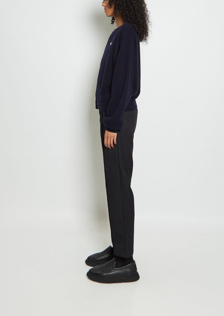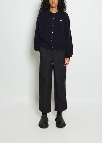 Danton navy crewneck cardigan with contrast ivory buttons and rib trim finish at neckline, sleeve cuffs and hem. Danton logo patch at chest.