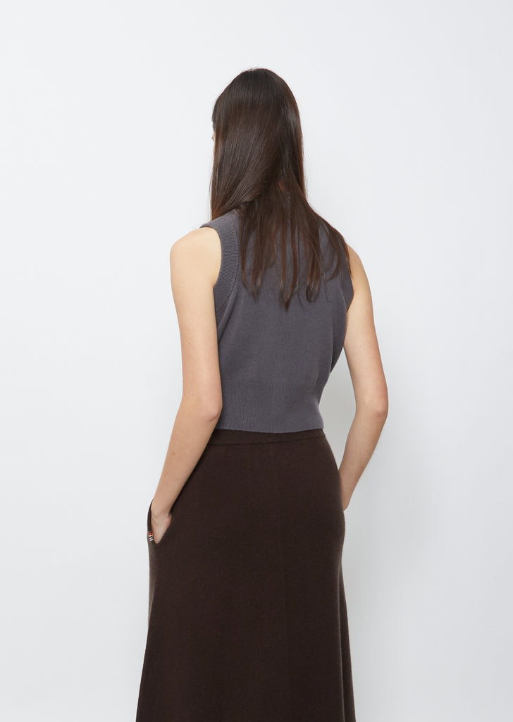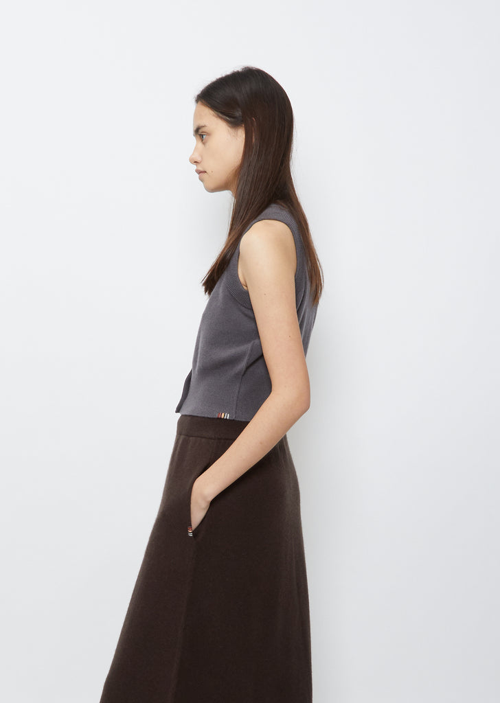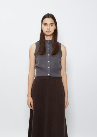 Extreme Cashmere concrete grey sleeveless vest cardigan in a luxe cashmere blend. Features tonal buttons with rib trim finishes at neckline, inner placket, armholes and hem. Signature rainbow embroidery at left hem. Cropped with a relaxed fit.