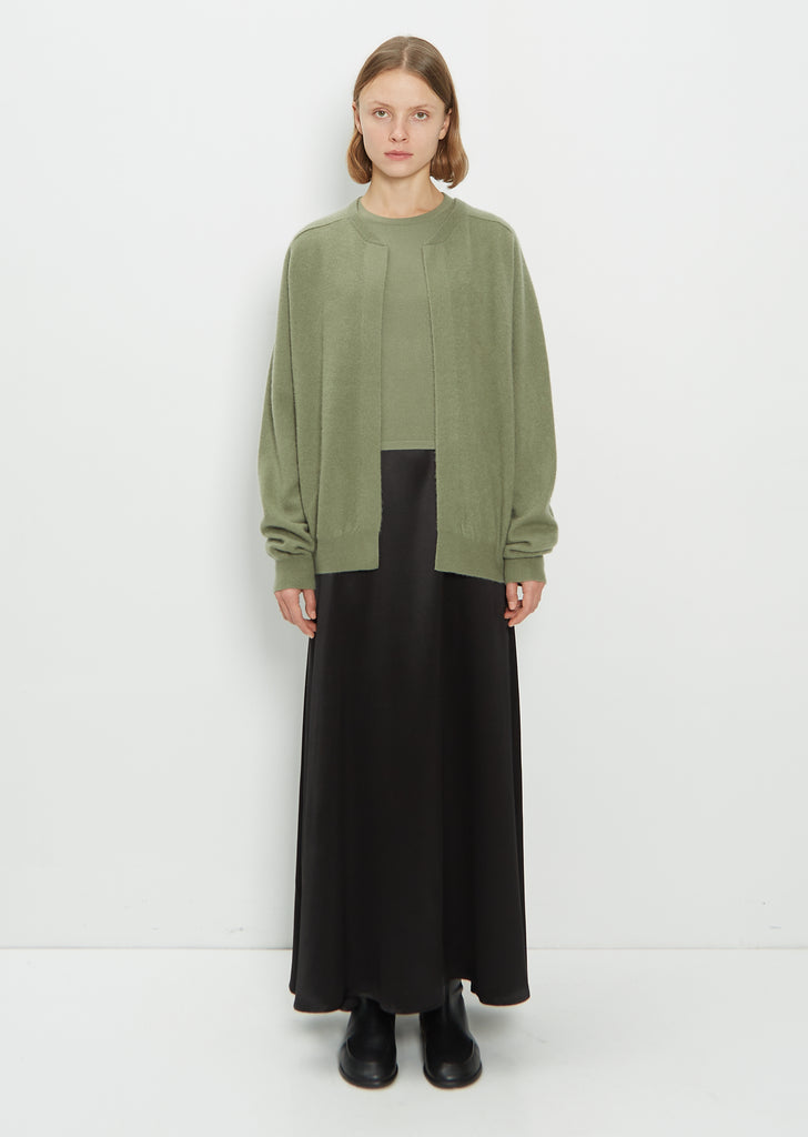 Frenckenberger light kale green knit bomber with saddle shoulder sleeves in medium weight cashmere knit. Rib trim round neckline, sleeve cuffs and hem. Relaxed fit with elongated sleeves.