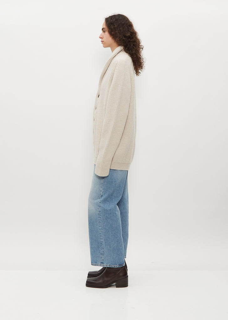 Brand Signature Piece — Begg x Co oat melange unisex cardigan with a classic fisherman-style knitted in mid-gauge with mid-weight cashmere. Straight silhouette with a relaxed fit.