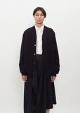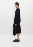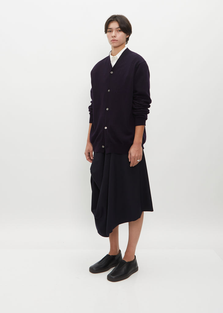 Comme des Garçons navy oversized cardigan with a classic y neckline knit in pure cashmere. Finished with natural horn buttons and wide ribbed trim on cuff and hem.