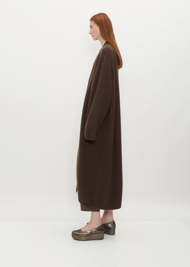 Dušan dark brown long open front cardigan in pure ribbed heavyweight cashmere knit. Features raglan sleeves, thick border front edge, and continuous rib finished cuffs and hem.
