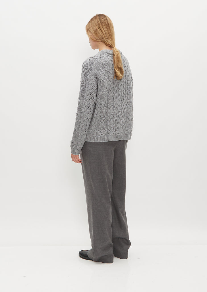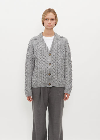 Loulou Studio grey melange cable knit cardigan with a v-neckline in merino wool and cashmere. Features raglan sleeves and wide rib trim along the neck, cuff, and hem. Finished with tortoise buttons.
