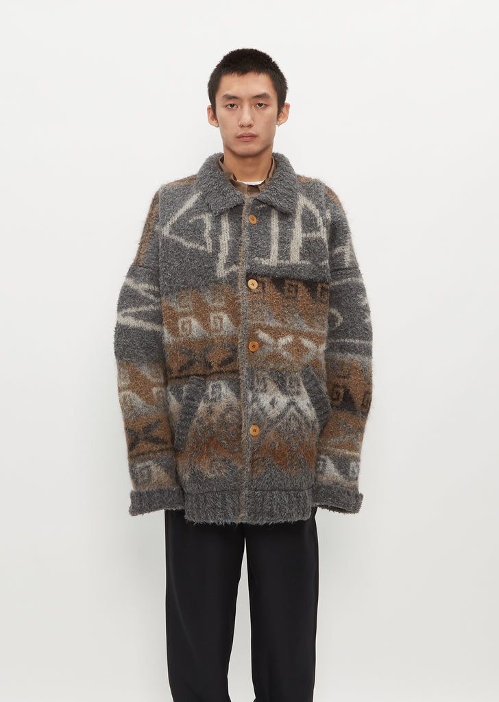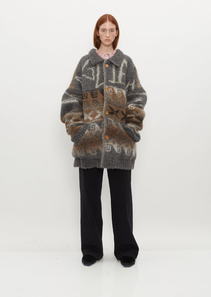 Magliano oversized mid-grey and brown tone jacquard mix single-breasted coat in a furry alpaca yarn blend chunky knit. Features a solid color turn down collar, dropped shoulders, turned up cuffs and side slant pockets. Finished with ribbed trim along pockets and contrast buttons. Fully lined in beige-tone fleece for ultimate softness.