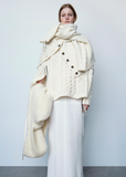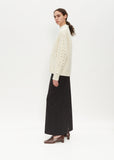 Maria McManus ivory oversized cable knit cardigan with v-neckline knit in extra fine recycled merino wool. Features dropped shoulders, extended placket hem, and interior sleeve splits which can be styled with arms worn out or in. Finished with contrast black stitching on interior opening, loose strands from hem and cuffs and tortoise buttons.