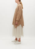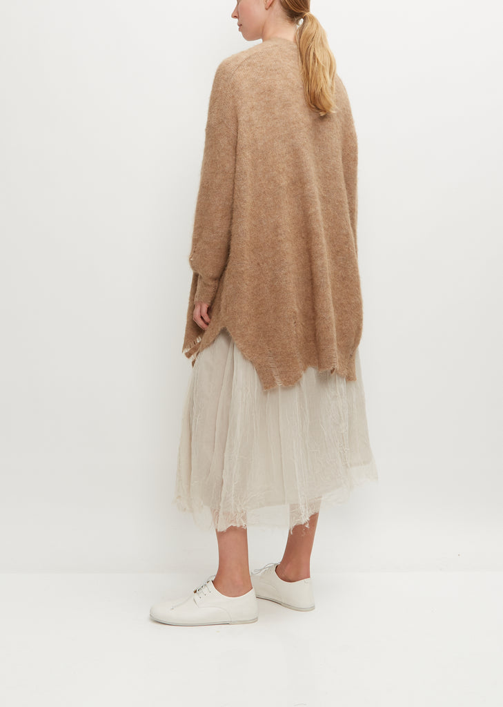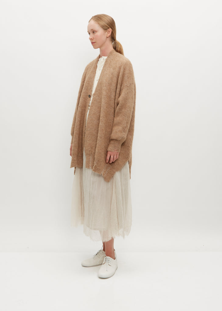 Pas de Calais camel longline cardigan with a v-neckline in a brushed baby alpaca blend with a unique knit pattern. Features a draped front, side splits, distressed details, and a single button closure.