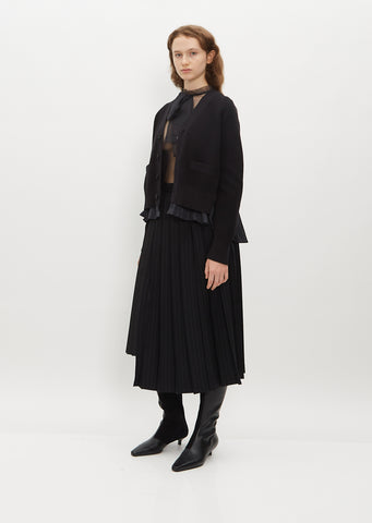 Sacai black slightly cropped cardigan in a cotton-wool blend knit with a sheer upper back and satin hem. Features a half satin back printed with chalk stripes, ruffled satin hem in front, side splits, and welt pockets. Finished with tonal black buttons and wide ribbed trim along hem and cuffs.
