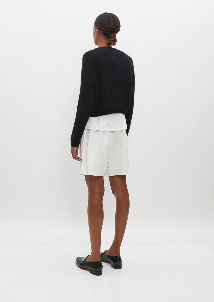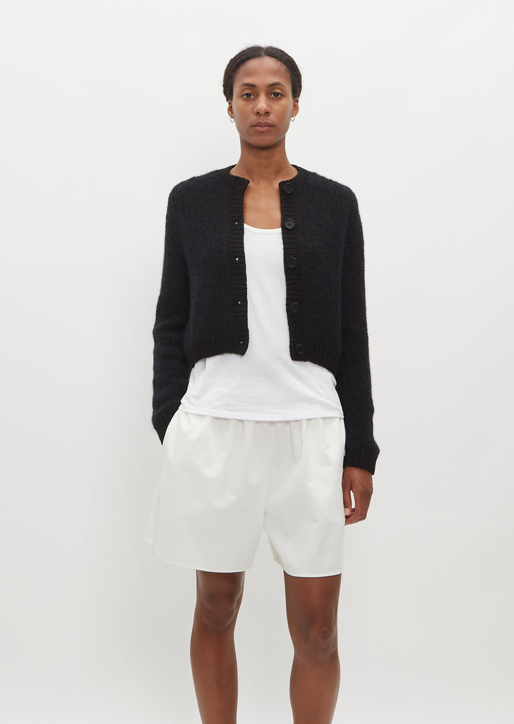 Wommelsdorff black cropped cardigan with a round neckline and relaxed fit hand knit in pure cashmere. Finished with tonal buttons and one by one wide ribbed trim along neck, cuff and hem.