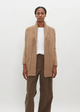 Wommelsdorff camel long line cardigan with an open front and shawl collar hand knit in pure cashmere. Features raglan sleeves, patch pockets and one by one ribbed knit trim.
