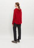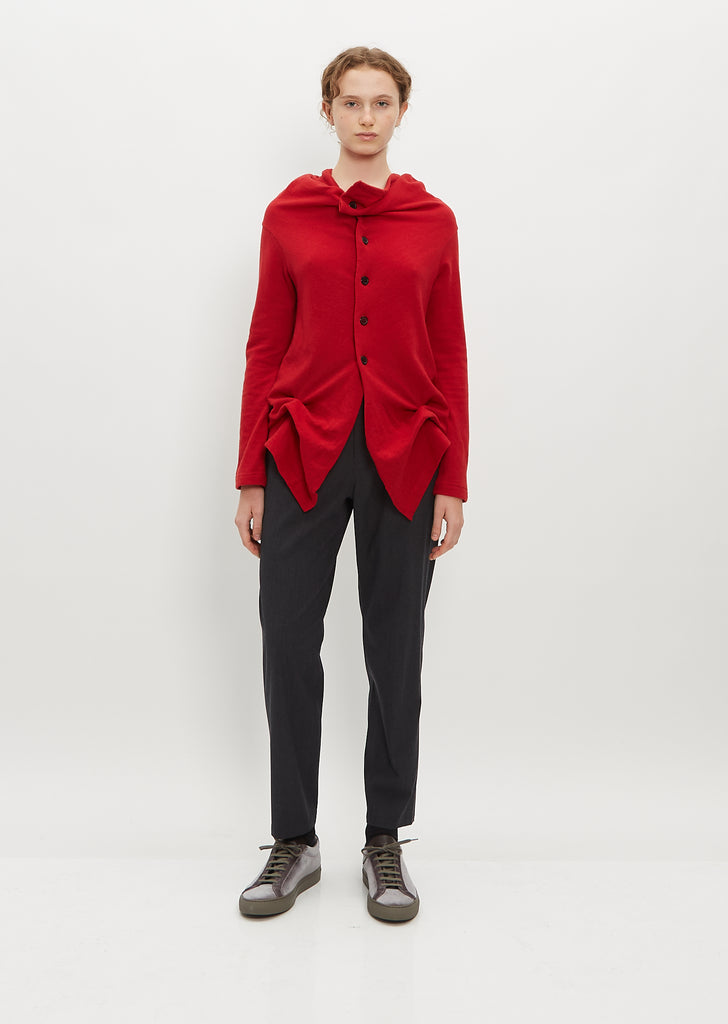Y's by Yohji Yamamoto red cardigan with a ruffled front hem and wide cowl neckline in a wool blend. Features a gathered back hem and tonal buttons.