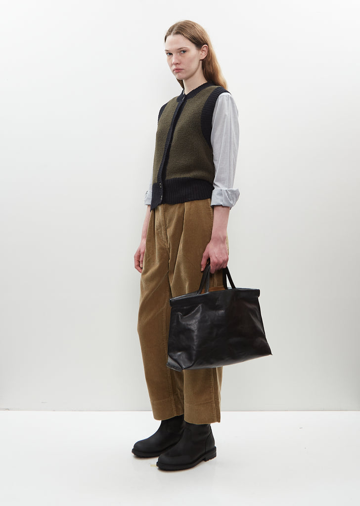 Bea Mombaers black shopper bag in medium size with an adjustable and detachable tonal shoulder strap and short top handles in buffalo leather. Features a detachable interior pouch, a detachable clasp key ring, a single interior zipper pocket and two interior slip pockets. Top handles can convert into a single shoulder strap with a ruching effect. Lined in cotton canvas.