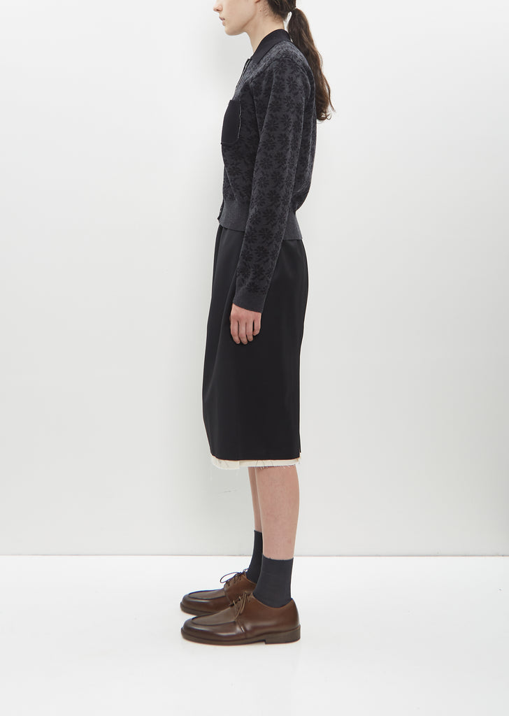 Camiel Fortgens black and grey polo cardigan with a floral pattern in merino wool and cotton blend knit. Features a spread collar, single chest patch pocket, and signature loose thread finish at neckline, pocket and placket. Finished with rib trim at collar, cuffs and hem. Tonal button front closure. Regular fit.