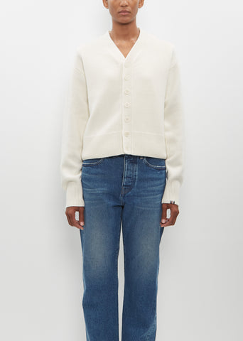 Extreme Cashmere cream cardigan with a V-neck and a corozo buttons closure at front in soft heavy knit cashmere. Features dropped shoulders, voluminous sleeves and rib trim at neck, cuffs and hem.