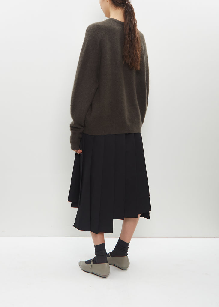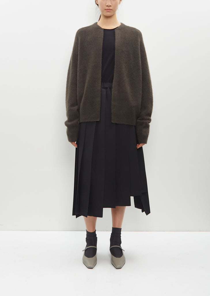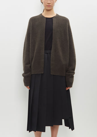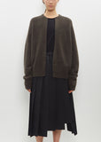 Frenckenberger black olive open cardigan with raglan sleeves in a mid-weight felted cashmere. Features a rib trim finish at neck, cuffs and hem. Relaxed fit.