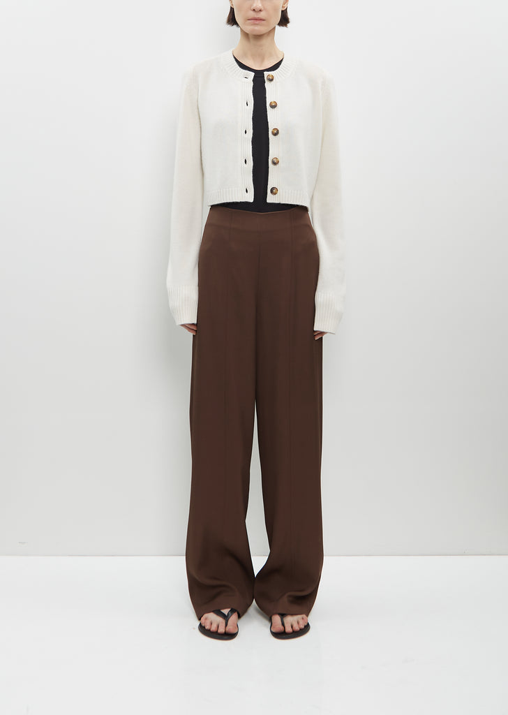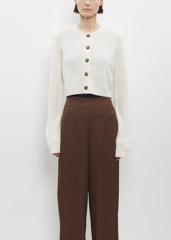 Loulou Studio ivory cropped cardigan with round neck in pure cashmere. Features a rib trim at neckline, placket, cuffs, and hem. Finished with a tortoise-tone buttons closure at front and signature embroidered shell at bottom left.