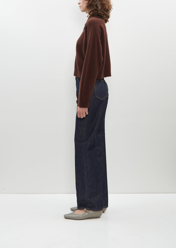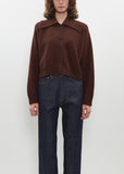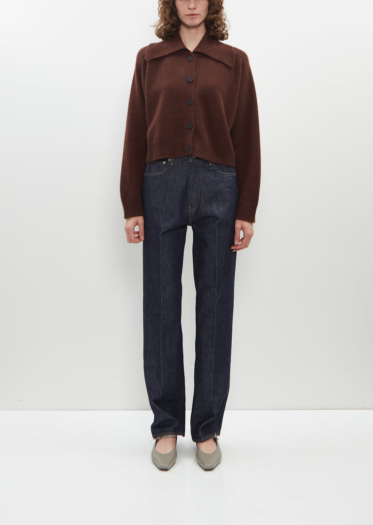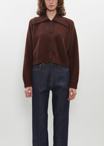 Loulou Studio chocolate brown cardigan with a wide spread ribbed collar and dropped shoulders in wool and yak wool mid-weight blend knit. Features a black buttons closure at front, and a rib trim at cuffs, and hem. Finished signature embroidered shell at bottom left. Relaxed fit.