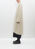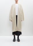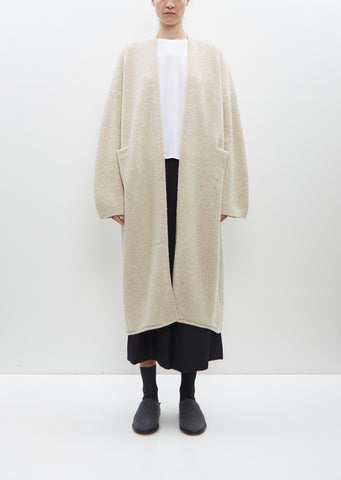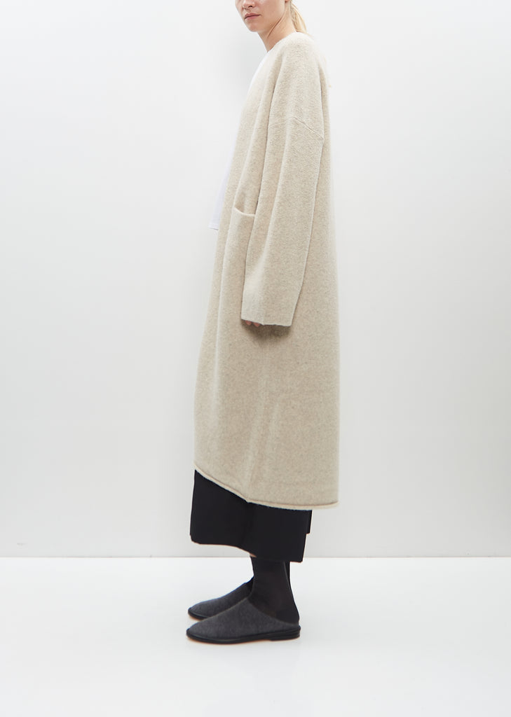 Brand Signature Piece — Lauren Manoogian ecru long open front cardigan in mid-weight fine alpaca and merino wool blend knit. Features slit top pockets, clean finished edges, and a rolled finished hem.