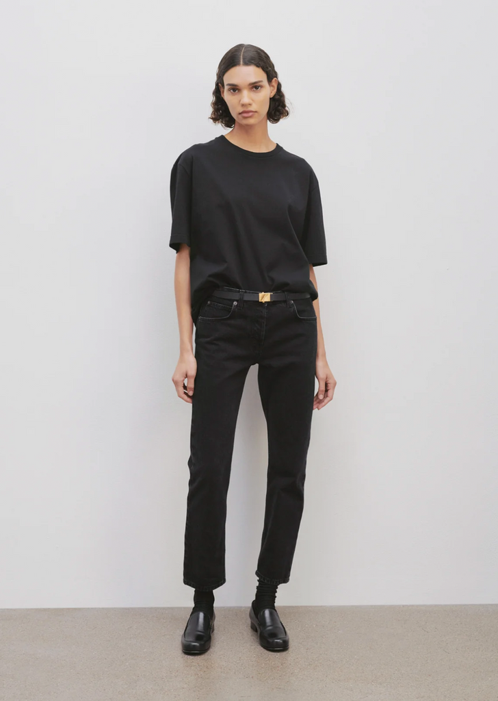 The Row black mid-rise skinny leg 5-pocket jean in stone washed cotton denim. Features tonal top stitching and button-fly closure.