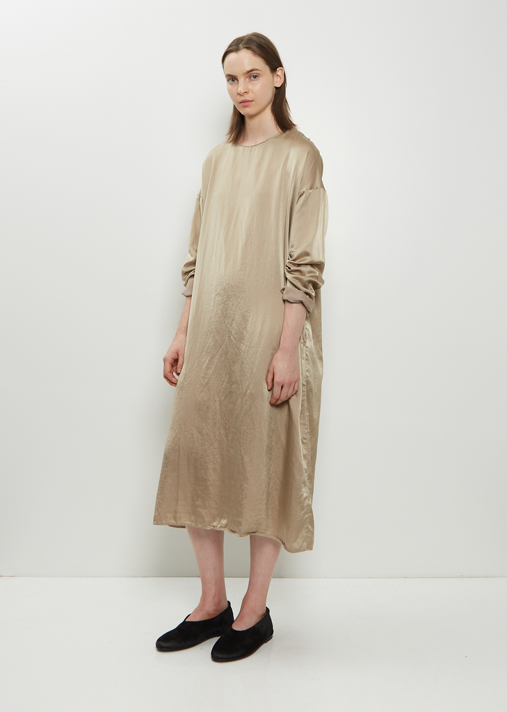 Album di Famiglia marron glace pullover dress with a round neckline and long sleeves in silk cotton blend. Features dropped shoulders, side seam pockets, and slit at back hem.