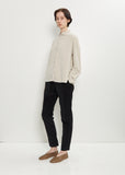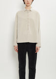 Album di Famiglia signature button-down shirt with a small pointed collar and 3/4 sleeves in a oatmeal beige stretch cotton velvet. Features dropped shoulders, straight hem, and split details at side hems. Finished with tonal buttons.