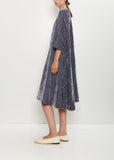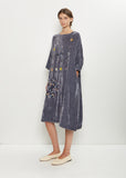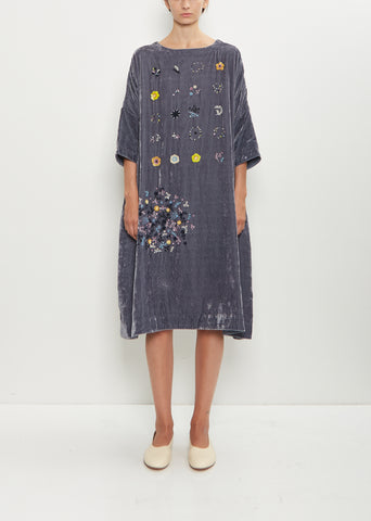 AODRESS blue grey pullover tunic dress with a round neckline and elbow length sleeves in silk blend velvet with hand-embroidered sequins floral details. Features dropped shoulders and angled pockets. Lined in a lightweight blue cotton.