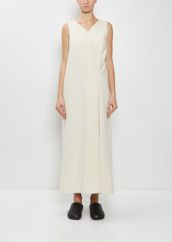 Auralee ivory white sleeveless dress with a high V-neckline and asymmetrical stitched drape detail at front in mid-weight wool tweed. Features a V-neckline at back and concealed zip fastening. Lined in tonal cupro.