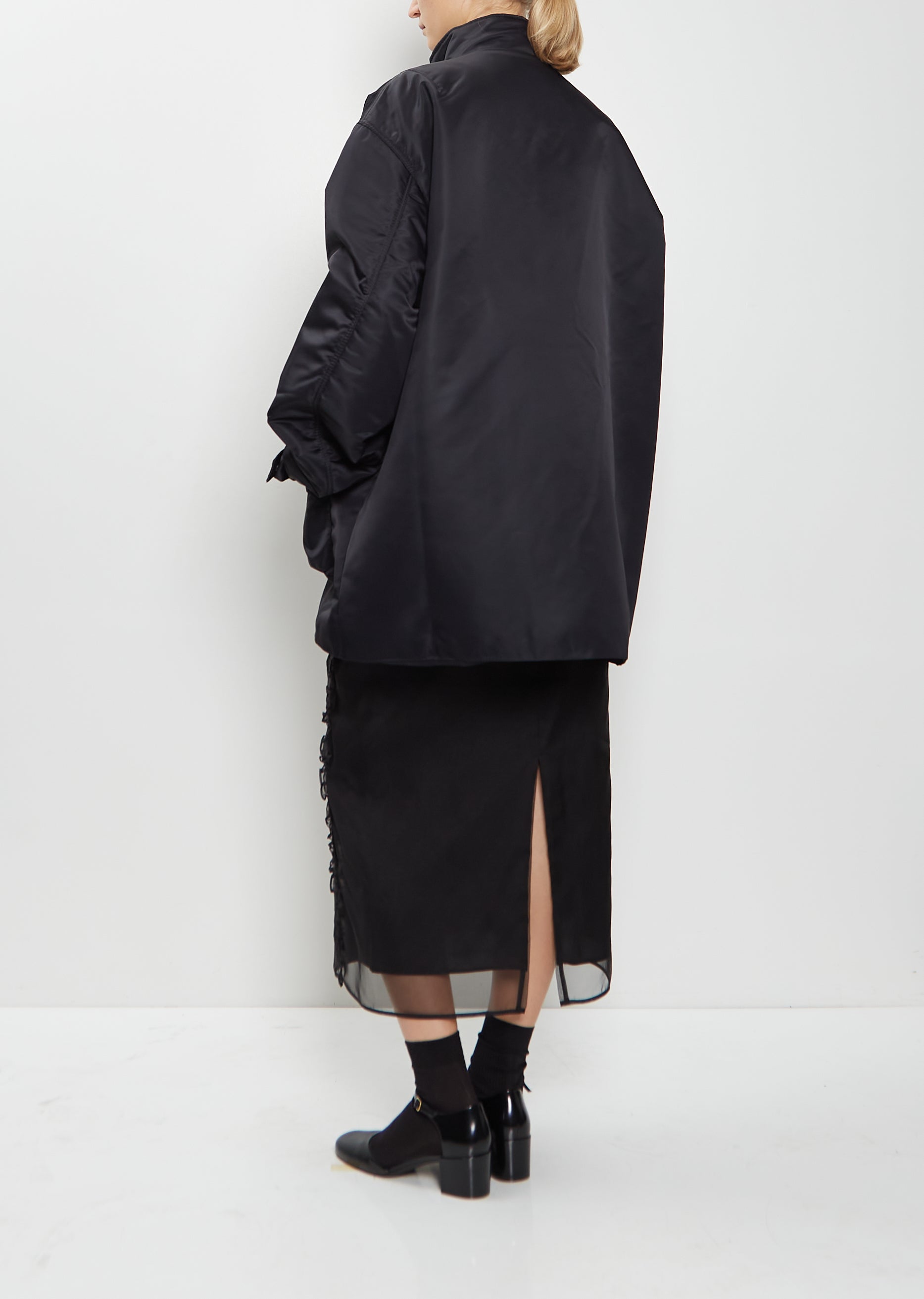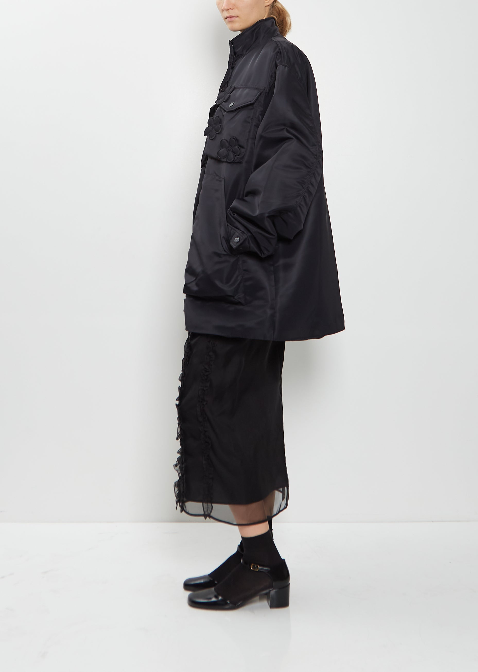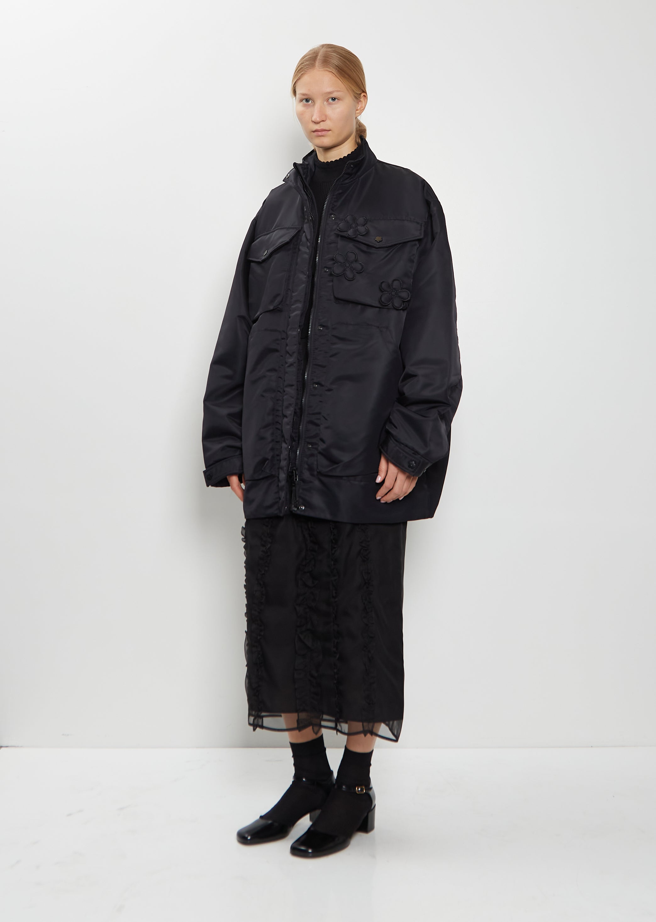 Cecilie Bahnsen black jacket with a stand collar and concealed zipper and press button fastening in technical nylon. Features chest press button flap pockets, signature floral appliqués at left chest pocket, angled patch pockets, adjustable press button tab cuffs, and an interior drawcord hem. Toggles and press buttons finished with floral motifs. Lined in tonal satin fabric.